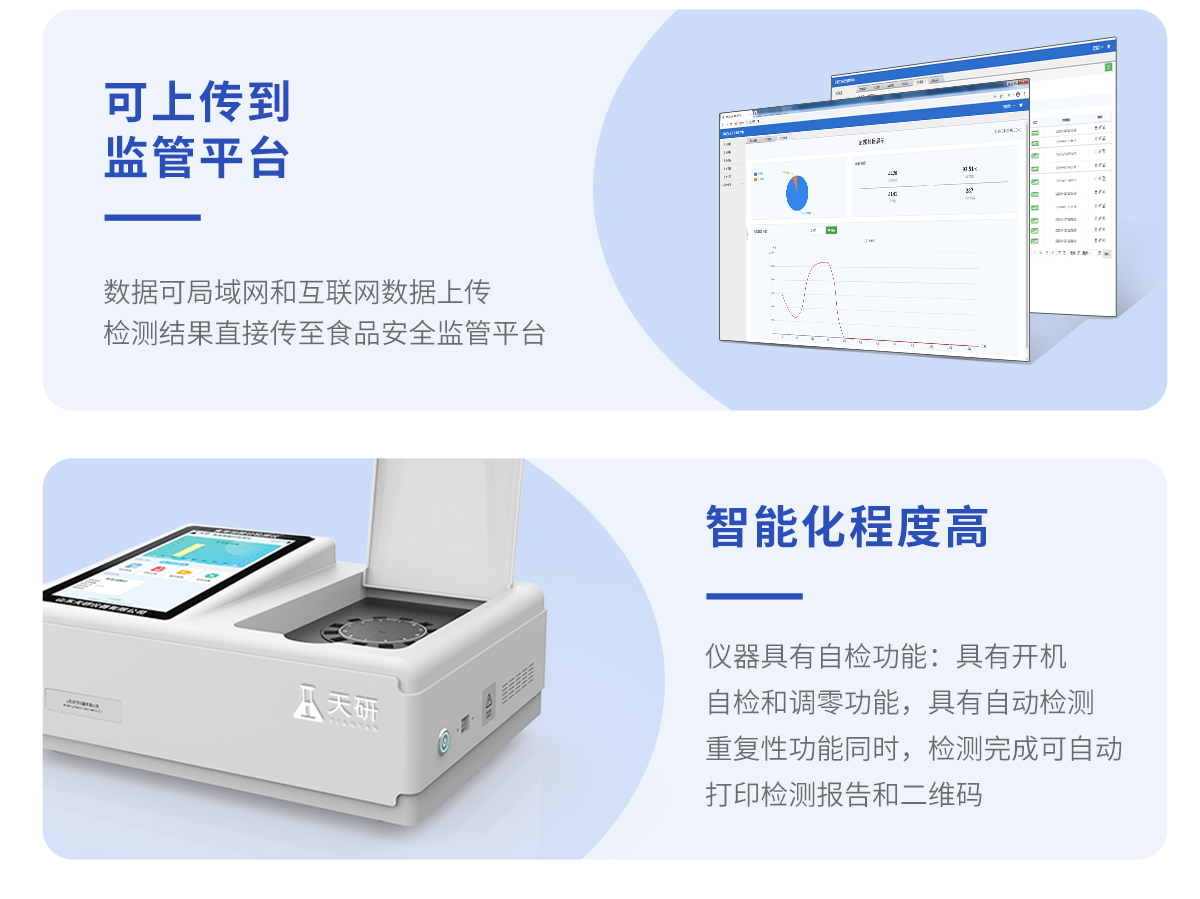 | 儀器采用臺式一體化系統(tǒng)檢測技術,將分光光度模塊、新型農殘檢測模塊、數字化管理模塊、無線通訊模塊高度集成于一體,支持檢測200種食品安全檢測項目,同時預留升級檢測方法。 | 儀器檢測模塊標準化、智能化,可隨意自由組合。檢測箱體內置多個標準檢測單元,檢測模塊可以調整配置。 | 儀器采用全新安卓智能系統(tǒng),主控芯片采用 ARM Cortex-A7,RK3288/4核處理器,10.1寸高清液晶觸摸豎屏,更加**的UI交互界面,運轉快捷;儀器配備無線通信模塊: 4G(APN)通訊模塊、Wifi模塊,藍牙傳輸,同時具有雙USB接口以及RJ45接口能以多種方式實現數據保存和數據傳輸功能。 | 創(chuàng)新檢測模式: | ★檢測通道:≥12通道;采用精密旋轉比色池設計,使用同芯片同光源校準精度,解決不同光源之間的誤差值。1-12通道間誤差0.1%。(**號:ZL202022821055.2) | ★儀器具有自動識別比色皿檢測功能,即:將樣品比色皿放入儀器后,點擊樣品檢測,儀器自動識別比色皿進行通道檢測。 | 進口高精光源: | 高精度進口四波長冷光源,通道配置 410、520、590、630nm 波長光源,一個光源芯片驅動一個光源,誤差極小,每臺設備單獨**校準光源,**比對,同時參照四種不同波段光源全方位覆蓋市面上99%的農殘食品項目檢測。 | 智能化操作系統(tǒng): | 便捷操作系統(tǒng):設備檢測時可在同一檢測界面自動對應相關檢測通道一次性選擇1-12個樣品名稱,無須退出界面,節(jié)省操作時間。 | 數據集成系統(tǒng):設備首頁自動統(tǒng)計檢測數據包含:周檢測數據、月檢測數據,全部檢測總數量,均包含檢測總數,合格數,不合格數,以及相關柱形分析圖,對各項檢測數據清晰掌握,無需電腦查詢,更加快捷直觀。 | 項目預設系統(tǒng):支持添加單個及多個相同或不相同的任務預設,一鍵快速調取,每一個任務分別可以設置不同的樣品、批次、編號、來源、備注、抽樣信息、檢測信息、受檢信息、復核信息等更多信息。無縫鏈接平臺和APP實時查看下發(fā)任務。 | 數據監(jiān)管系統(tǒng):同步對接監(jiān)管平臺,數據可局域網和互聯(lián)網數據上傳,檢測結果可選擇直接傳至食品安全監(jiān)管平臺。集成OSS輸出存儲服務、區(qū)分設備定向管理應用,進行區(qū)域食品安全監(jiān)管及大數據分析處理與數據統(tǒng)計,檢測區(qū)域食品安全長短期動態(tài),達到食品安全問題預估、預警。 | 自定義打印系統(tǒng):內置全新打印系統(tǒng),新創(chuàng)自定義打印方式,可按需靈活設置開啟或關閉:產品合格證(國家農業(yè)部標準要求),二維碼,抽樣信息、檢測信息,受檢信息、復核信息、抽樣日期、檢測日期等信息的打印。 | 系統(tǒng)遠程更新功能:可定向分客戶分儀器更新系統(tǒng),按照不同客戶后期實際需求添加項目,無需機器返廠,即可遠程實時升級全新系統(tǒng),節(jié)省時間成本及避免運輸造成設備損壞。 | 儀器主機采用一體化防水、抗壓、防撞擊、防腐蝕箱體設計,同時配備交直流供電,可連接車載電源,可選配大容量充電鋰電池,滿足現場野外檢測需求。 | 安全證書,放心保障:儀器具有中國計量科學研究院校準證書,**認證。 |