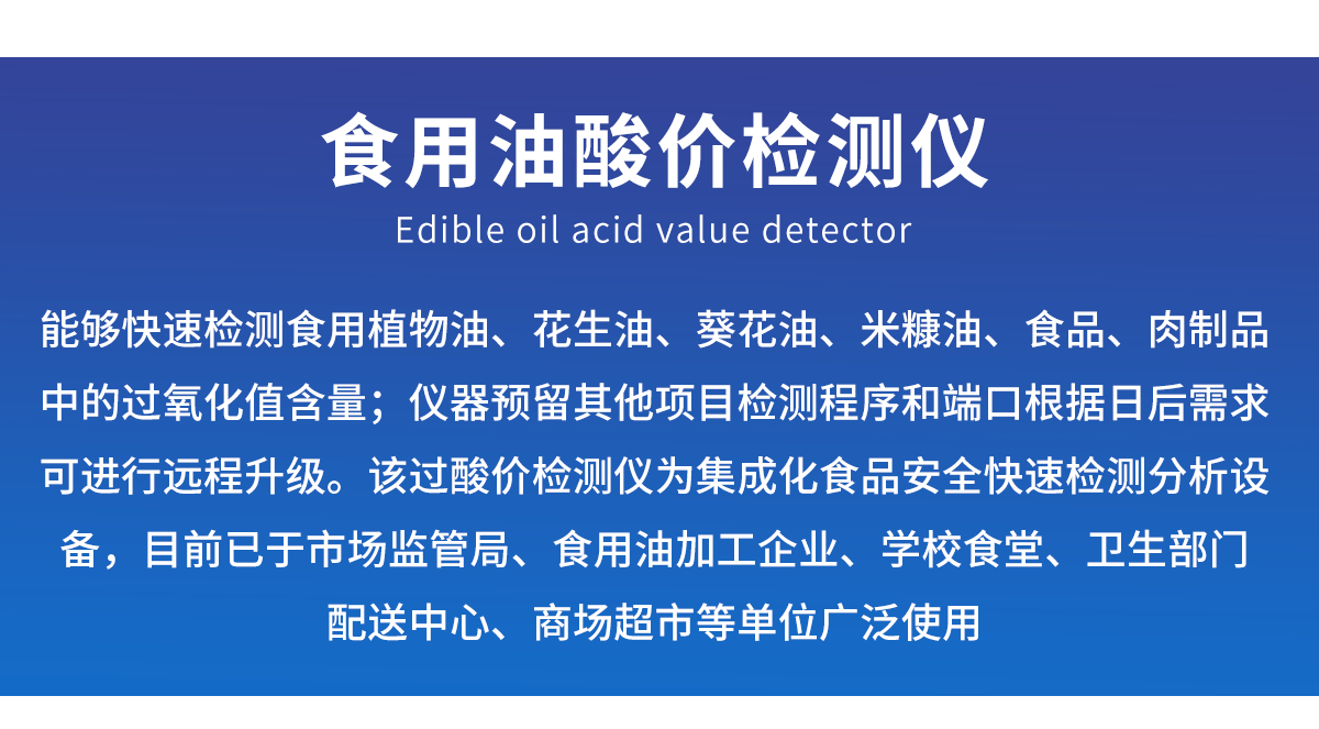 廣泛應用于質量監(jiān)督檢驗、工商管理、油炸食品生產基地、食藥監(jiān)局、衛(wèi)生部門、肉制品食品深加工企業(yè)、商場超市、各大食品安全監(jiān)測系統(tǒng)等單位使用。