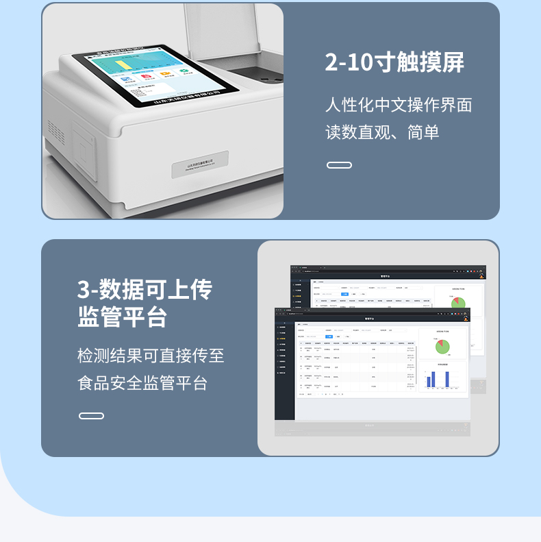 | 儀器采用臺(tái)式一體化系統(tǒng)檢測(cè)技術(shù),將分光光度模塊、新型農(nóng)殘檢測(cè)模塊、數(shù)字化管理模塊、無(wú)線(xiàn)通訊模塊高度集成于一體,支持檢測(cè)200種食品安全檢測(cè)項(xiàng)目,同時(shí)預(yù)留升級(jí)檢測(cè)方法。 | 儀器檢測(cè)模塊標(biāo)準(zhǔn)化、智能化,可隨意自由組合。檢測(cè)箱體內(nèi)置多個(gè)標(biāo)準(zhǔn)檢測(cè)單元,檢測(cè)模塊可以調(diào)整配置。 | 儀器采用全新安卓智能系統(tǒng),主控芯片采用 ARM Cortex-A7,RK3288/4核處理器,10.1寸高清液晶觸摸豎屏,更加**的UI交互界面,運(yùn)轉(zhuǎn)快捷;儀器配備無(wú)線(xiàn)通信模塊: 4G(APN)通訊模塊、Wifi模塊,藍(lán)牙傳輸,同時(shí)具有雙USB接口以及RJ45接口能以多種方式實(shí)現(xiàn)數(shù)據(jù)保存和數(shù)據(jù)傳輸功能。 | 創(chuàng)新檢測(cè)模式: | ★檢測(cè)通道:≥12通道;采用精密旋轉(zhuǎn)比色池設(shè)計(jì),使用同芯片同光源校準(zhǔn)精度,解決不同光源之間的誤差值。1-12通道間誤差0.1%。(**號(hào):ZL202022821055.2) | ★儀器具有自動(dòng)識(shí)別比色皿檢測(cè)功能,即:將樣品比色皿放入儀器后,點(diǎn)擊樣品檢測(cè),儀器自動(dòng)識(shí)別比色皿進(jìn)行通道檢測(cè)。 | 進(jìn)口高精光源: | 高精度進(jìn)口四波長(zhǎng)冷光源,通道配置 410、520、590、630nm 波長(zhǎng)光源,一個(gè)光源芯片驅(qū)動(dòng)一個(gè)光源,誤差極小,每臺(tái)設(shè)備單獨(dú)**校準(zhǔn)光源,**比對(duì),同時(shí)參照四種不同波段光源全方位覆蓋市面上99%的農(nóng)殘食品項(xiàng)目檢測(cè)。 | 智能化操作系統(tǒng): | 便捷操作系統(tǒng):設(shè)備檢測(cè)時(shí)可在同一檢測(cè)界面自動(dòng)對(duì)應(yīng)相關(guān)檢測(cè)通道一次性選擇1-12個(gè)樣品名稱(chēng),無(wú)須退出界面,節(jié)省操作時(shí)間。 | 數(shù)據(jù)集成系統(tǒng):設(shè)備首頁(yè)自動(dòng)統(tǒng)計(jì)檢測(cè)數(shù)據(jù)包含:周檢測(cè)數(shù)據(jù)、月檢測(cè)數(shù)據(jù),全部檢測(cè)總數(shù)量,均包含檢測(cè)總數(shù),合格數(shù),不合格數(shù),以及相關(guān)柱形分析圖,對(duì)各項(xiàng)檢測(cè)數(shù)據(jù)清晰掌握,無(wú)需電腦查詢(xún),更加快捷直觀(guān)。 | 項(xiàng)目預(yù)設(shè)系統(tǒng):支持添加單個(gè)及多個(gè)相同或不相同的任務(wù)預(yù)設(shè),一鍵快速調(diào)取,每一個(gè)任務(wù)分別可以設(shè)置不同的樣品、批次、編號(hào)、來(lái)源、備注、抽樣信息、檢測(cè)信息、受檢信息、復(fù)核信息等更多信息。無(wú)縫鏈接平臺(tái)和APP實(shí)時(shí)查看下發(fā)任務(wù)。 | 數(shù)據(jù)監(jiān)管系統(tǒng):同步對(duì)接監(jiān)管平臺(tái),數(shù)據(jù)可局域網(wǎng)和互聯(lián)網(wǎng)數(shù)據(jù)上傳,檢測(cè)結(jié)果可選擇直接傳至食品安全監(jiān)管平臺(tái)。集成OSS輸出存儲(chǔ)服務(wù)、區(qū)分設(shè)備定向管理應(yīng)用,進(jìn)行區(qū)域食品安全監(jiān)管及大數(shù)據(jù)分析處理與數(shù)據(jù)統(tǒng)計(jì),檢測(cè)區(qū)域食品安全長(zhǎng)短期動(dòng)態(tài),達(dá)到食品安全問(wèn)題預(yù)估、預(yù)警。 | 自定義打印系統(tǒng):內(nèi)置全新打印系統(tǒng),新創(chuàng)自定義打印方式,可按需靈活設(shè)置開(kāi)啟或關(guān)閉:產(chǎn)品合格證(國(guó)家農(nóng)業(yè)部標(biāo)準(zhǔn)要求),二維碼,抽樣信息、檢測(cè)信息,受檢信息、復(fù)核信息、抽樣日期、檢測(cè)日期等信息的打印。 | 系統(tǒng)遠(yuǎn)程更新功能:可定向分客戶(hù)分儀器更新系統(tǒng),按照不同客戶(hù)后期實(shí)際需求添加項(xiàng)目,無(wú)需機(jī)器返廠(chǎng),即可遠(yuǎn)程實(shí)時(shí)升級(jí)全新系統(tǒng),節(jié)省時(shí)間成本及避免運(yùn)輸造成設(shè)備損壞。 | 儀器主機(jī)采用一體化防水、抗壓、防撞擊、防腐蝕箱體設(shè)計(jì),同時(shí)配備交直流供電,可連接車(chē)載電源,可選配大容量充電鋰電池,滿(mǎn)足現(xiàn)場(chǎng)野外檢測(cè)需求。 | 安全證書(shū),放心保障:儀器具有中國(guó)計(jì)量科學(xué)研究院校準(zhǔn)證書(shū),**認(rèn)證。 |