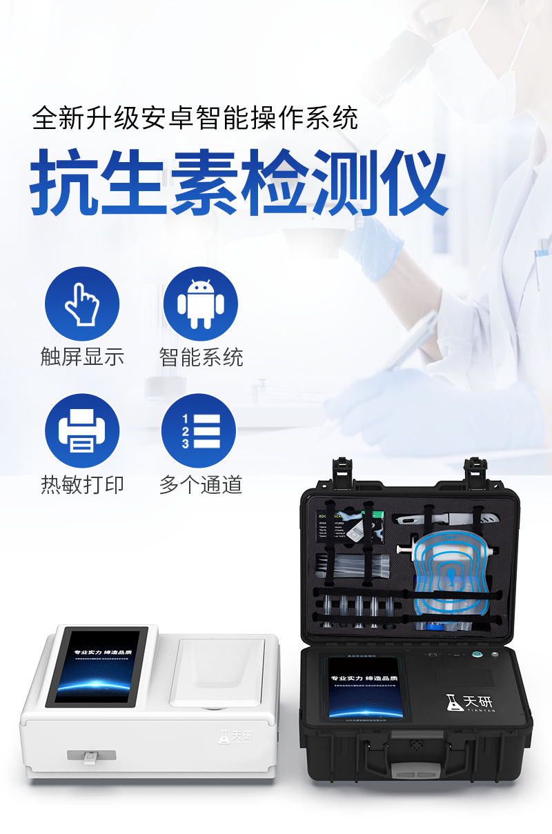 山東天研儀器有限公司生產(chǎn)的高智能食品安全檢測(cè)儀為集成化食品安全快速檢測(cè)分析設(shè)備,采用臺(tái)式一體化設(shè)計(jì),可快速檢測(cè)200多種食品安全項(xiàng)目,包含非食用化學(xué)物質(zhì)、濫用食品添加劑、農(nóng)藥殘留、獸藥殘留、重金屬、病害肉、營(yíng)養(yǎng)強(qiáng)化劑、抗生素類殘留、激素類殘留、真菌毒素類殘留、化學(xué)類殘留等項(xiàng)目的定性定量檢測(cè)。目前廣泛應(yīng)用于市場(chǎng)監(jiān)管局、檢測(cè)中心、衛(wèi)生監(jiān)督部門、農(nóng)業(yè)部門、院校及各單位食堂、食品肉產(chǎn)品深加工企業(yè)、商超市場(chǎng)、司法部門、餐飲機(jī)構(gòu)、養(yǎng)殖場(chǎng)、屠宰場(chǎng)、檢驗(yàn)檢疫部門等單位。