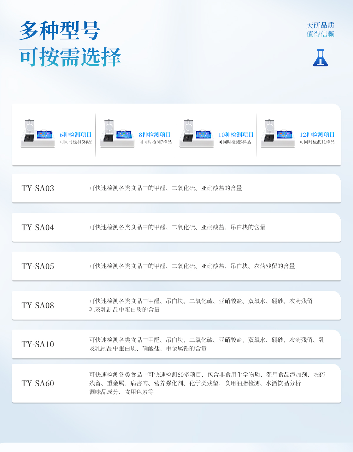 多功能食品安全檢測儀可快速檢測200多項目,包含非食用化學(xué)物質(zhì)、濫用食品添加劑、農(nóng)藥殘留、獸藥殘留、重金屬、病害肉、營養(yǎng)強化劑、抗生素類殘留、激素類殘留、真菌毒素類殘留、化學(xué)類殘留等現(xiàn)場的定性定量檢測。該多功能食品安全檢測儀為集成化食品安全快速檢測分析設(shè)備,廣泛應(yīng)用于市場監(jiān)管局、檢測中心、衛(wèi)生監(jiān)督部門、農(nóng)業(yè)部門、院校及各單位食堂、食品肉產(chǎn)品深加工企業(yè)、商超市場、司法部門、餐飲機構(gòu)、養(yǎng)殖場、屠宰場、檢驗檢疫部門等單位使用。