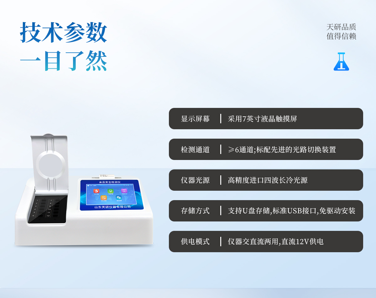 | 安卓智能操作系統(tǒng),采用更加**和人性化操作,儀器具有網(wǎng)線連接、wifi聯(lián)網(wǎng)上傳、GPRS無線遠傳功能,快速上傳數(shù)據(jù)。 | 智能化程度高,儀器具有自檢功能:具有開機自檢和調(diào)零功能,具有自動檢測重復(fù)性功能。 | 檢測通道:≥12個檢測通道,可以同時測試多個樣品,每個樣品由程序控制分別獨立工作,不會互相干擾。 | 顯示方式:≥8英寸液晶觸摸屏顯示,人性化中文操作界面,讀數(shù)直觀、簡單。 | 配備新一代嵌入式熱敏打印機,可選擇手動打印或者自動打印,檢測完成可自動打印檢測報告和二維碼。 | 光源采用進口超高亮發(fā)光二極管,高精度、穩(wěn)定性強、光源可控、可以關(guān)掉不使用的光源,功耗更低。 | 采用USB2.0接口設(shè)計,方便數(shù)據(jù)的存貯和移動,并可隨時與計算機直接相連,并且可用計算機控制儀器。實現(xiàn)數(shù)據(jù)查詢、瀏覽、分析、統(tǒng)計、打印等。 | 儀器帶有監(jiān)管平臺。數(shù)據(jù)可局域網(wǎng)和互聯(lián)網(wǎng)數(shù)據(jù)上傳,檢測結(jié)果直接傳至食品安全監(jiān)管平臺。進行區(qū)域食品安全監(jiān)管及大數(shù)據(jù)分析處理,檢測區(qū)域食品安全長短期動態(tài),達到食品安全問題預(yù)估、預(yù)警 | 一體化便攜式快檢設(shè)備,滿足現(xiàn)場及流動檢測使用需求,能夠在同一軟件下實現(xiàn)所有檢測項目的檢測,并可通過同一窗口直觀顯示檢測結(jié)果。 | 儀器具有多品類多種類樣品菜單庫,可靈活選擇檢測樣品,不同的檢測通道可同時檢測不同的樣品項目。也可在儀器上直接編輯錄入樣品名稱、檢測指標、送檢單位等信息并保存進樣品數(shù)據(jù)庫。 | 樣品處理簡單省力,整體操作快速、安全、便捷。 | 儀器具有自身保護功能,可設(shè)置用戶名及密碼,防止非工作人員操作等。 | 高靈敏度,高檢測精度,高重復(fù)性精度,掃描式高精度光學(xué)傳感器。 | 儀器具有重新校準、鎖定、恢復(fù)出廠設(shè)置功能。 | 支持U盤存儲。 結(jié)果判定線可修改,對照值標定值可保存,斷電不丟失數(shù)據(jù)。 |