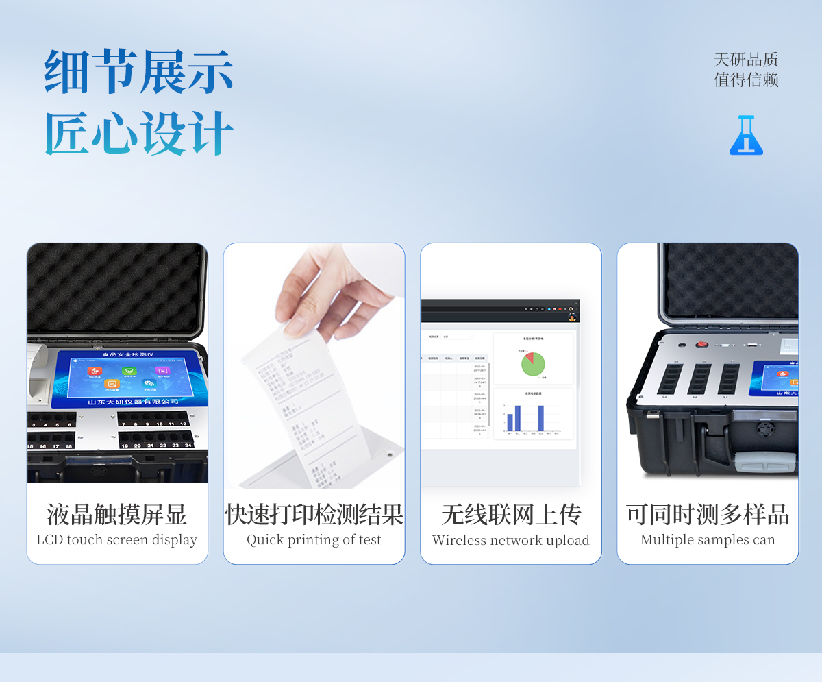 | 安卓智能操作系統(tǒng),采用更加**的UI交互界面,儀器具有wifi聯(lián)網(wǎng)上傳、4G聯(lián)網(wǎng)傳輸、GPRS無(wú)線遠(yuǎn)傳、網(wǎng)線連接功能,快速批量上傳數(shù)據(jù)。 | 智能化程度高,儀器具有自檢功能:具有開(kāi)機(jī)自檢和調(diào)零功能,具有自動(dòng)檢測(cè)重復(fù)性功能。 | 新一代高速熱敏打印機(jī),檢測(cè)完成可自動(dòng)打印或批量打印檢測(cè)報(bào)告和二維碼。 | 儀器帶有監(jiān)管平臺(tái),數(shù)據(jù)可局域網(wǎng)和互聯(lián)網(wǎng)數(shù)據(jù)上傳,檢測(cè)結(jié)果直接傳至食品安全監(jiān)管平臺(tái)。進(jìn)行區(qū)域食品安全監(jiān)管及大數(shù)據(jù)分析處理與數(shù)據(jù)統(tǒng)計(jì),檢測(cè)區(qū)域食品安全長(zhǎng)短期動(dòng)態(tài),達(dá)到食品安全問(wèn)題預(yù)估、預(yù)警 | 一體化主機(jī),包含食品安全檢測(cè)模塊、多通道農(nóng)藥殘留檢測(cè)模塊、膠體金免疫層析檢測(cè)模塊。 | 一體化便攜式快檢設(shè)備,滿足現(xiàn)場(chǎng)及流動(dòng)檢測(cè)使用需求,能夠在同一軟件下實(shí)現(xiàn)所有檢測(cè)項(xiàng)目的檢測(cè),并可通過(guò)同一窗口直觀顯示檢測(cè)結(jié)果。 | 膠體金模塊檢測(cè)方式:軌道式自動(dòng)傳輸掃描,檢測(cè)完成后自動(dòng)退出檢測(cè)卡。 | CT線自動(dòng)識(shí)別,無(wú)需手動(dòng)調(diào)整。 | 內(nèi)置強(qiáng)大的數(shù)據(jù)庫(kù),具有多品類多種類樣品菜單功能,可靈活選擇檢測(cè)樣品,不同的檢測(cè)通道可同時(shí)檢測(cè)不同的樣品項(xiàng)目。也可在儀器上直接編輯錄入樣品名稱、檢測(cè)指標(biāo)、送檢單位等信息并保存進(jìn)樣品數(shù)據(jù)庫(kù)。 | 產(chǎn)品內(nèi)置操作演示視頻,是您身邊的化驗(yàn)指導(dǎo)專家。 | 樣品處理簡(jiǎn)單省力,整體操作快速、安全、便捷。 | 儀器具有自身保護(hù)功能,可設(shè)置用戶名及密碼,防止非工作人員操作等。 | 高靈敏度,高檢測(cè)精度,高重復(fù)性精度,掃描式高精度光學(xué)傳感器。 | 結(jié)果判定線可修改,對(duì)照值標(biāo)定值可保存,斷電不丟失數(shù)據(jù)。 | 兼容市場(chǎng)上所有的膠體金卡,使用耗材不受限制,極大增強(qiáng)用戶使用體驗(yàn)。 | 儀器具有重新校準(zhǔn)、鎖定、恢復(fù)出廠設(shè)置功能。 |