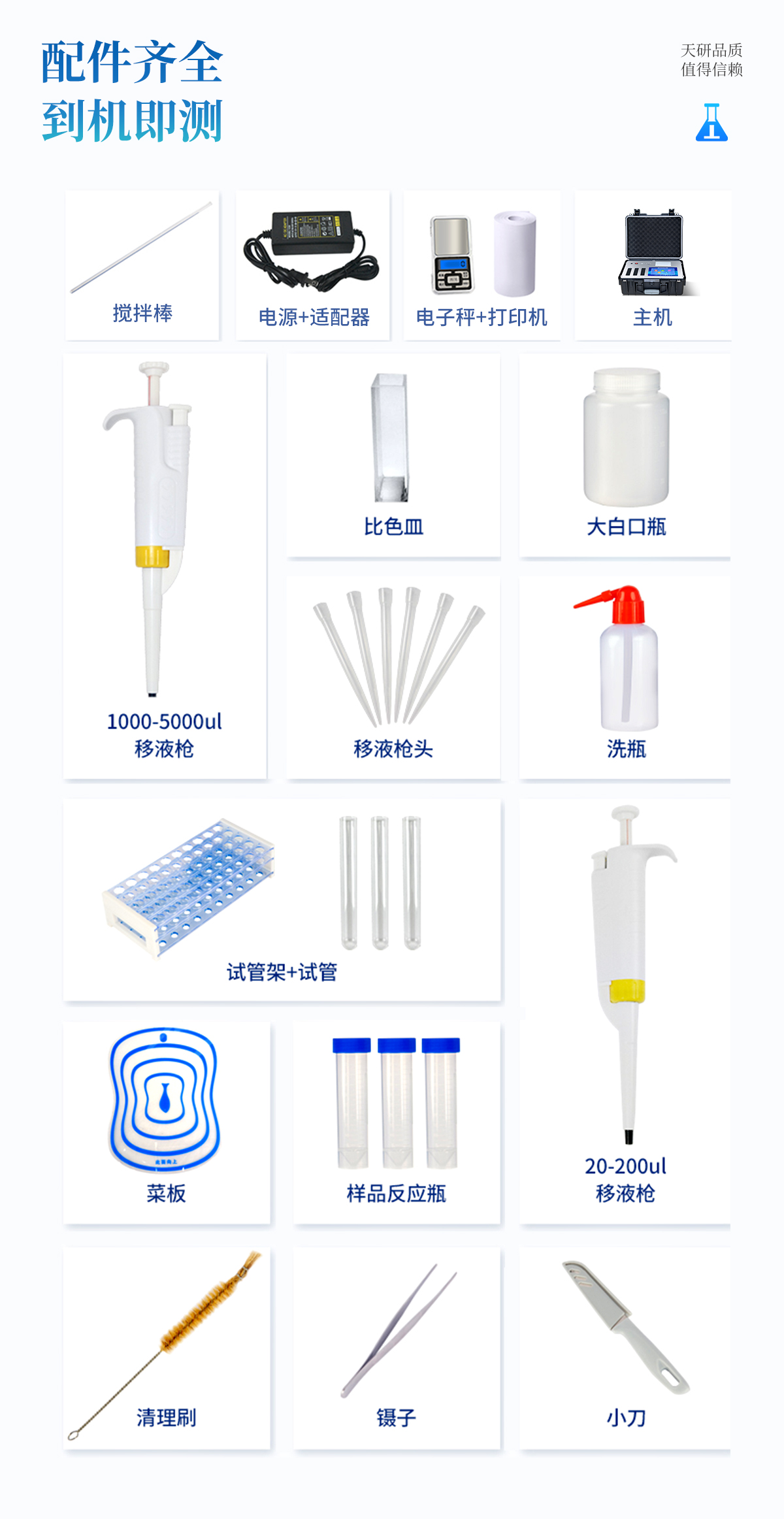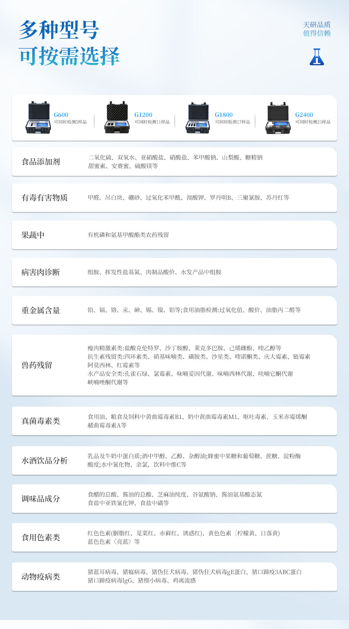 | 食品添加劑:二氧化硫、雙氧水、亞硝酸鹽、硝酸鹽、苯甲酸鈉、山梨酸、糖精鈉、甜蜜素、安賽蜜、硫酸鎂等 | 有毒有害物質(zhì):甲醛、吊白塊、硼砂、過(guò)氧化苯甲酰、溴酸鉀、羅丹明B、三聚氰胺、蘇丹紅等 | 果蔬中:有機(jī)磷和氨基甲酸酯類農(nóng)藥殘留; | 病害肉診斷:組胺、揮發(fā)性鹽基氮、肉制品酸價(jià)、水發(fā)產(chǎn)品中組胺 | 重金屬含量:鉛、鎘、鉻、汞、砷、錫、鎳、鋁等;食用油脂檢測(cè):過(guò)氧化值、酸價(jià)、油脂丙二醛等。 | 瘦肉精激素類(獸藥):鹽酸克倫特羅、沙丁胺醇、萊克多巴胺、己烯雌酚、喹乙醇等 | 抗生素殘留類(獸藥):四環(huán)素類、硝基呋喃類、磺胺類、沙星類、喹諾酮類、慶大霉素、鏈霉素、阿莫西林、紅霉素等 | 水產(chǎn)品安全類:孔雀石綠、氯霉素、呋喃妥因代謝、呋喃西林代謝、呋喃它酮代謝、呋喃唑酮代謝等 | 真菌毒素類:食用油、糧食及飼料中黃曲霉毒素B1、奶中黃曲霉毒素M1、嘔吐毒素、玉米赤霉烯酮、赭曲霉毒素A等 | 水酒飲品分析:乳品及牛奶中蛋白質(zhì);酒中甲醇、乙醇、雜醇油;蜂蜜中果糖和葡萄糖、蔗糖、淀粉酶、酸度;水中氰化物、余氯,飲料中維C等 | 調(diào)味品成分:食醋的總酸、醬油的總酸、芝麻油純度、谷氨酸鈉、醬油氨基酸態(tài)氮、食鹽中亞鐵氰化鉀、食鹽中碘等 | 食用色素類:紅色色素(胭脂紅、莧菜紅、赤蘚紅、誘惑紅)、黃色色素(檸檬黃、日落黃)、藍(lán)色色素(亮藍(lán))等 | 動(dòng)物疫病類:豬藍(lán)耳病毒、豬瘟病毒、豬偽狂犬病毒、豬偽狂犬病毒gE蛋白、豬口蹄疫3ABC蛋白、豬口蹄疫病毒IgG、豬細(xì)小病毒、雞禽流感等 |