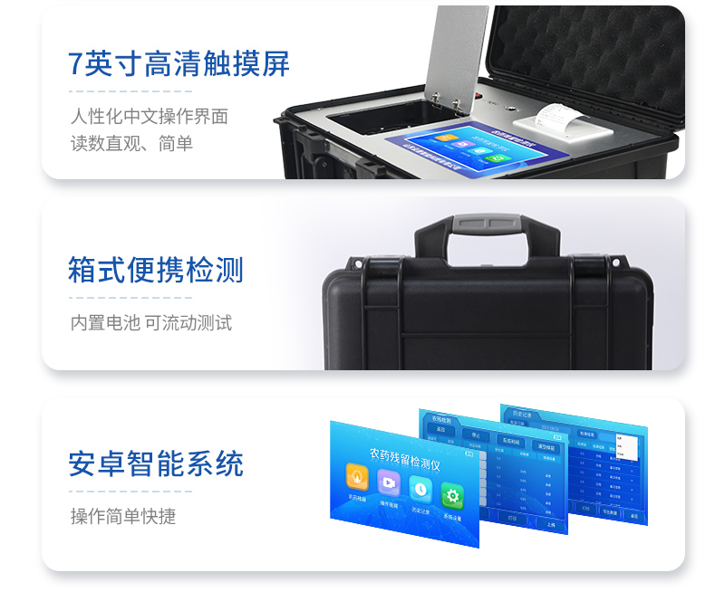 | 安卓智能操作系統(tǒng),采用更加**和人性化操作,儀器具有無(wú)線聯(lián)網(wǎng)上傳功能,快速上傳數(shù)據(jù),進(jìn)行數(shù)據(jù)統(tǒng)計(jì)和分析。 | 智能化程度高,儀器具有自檢功能:具有開機(jī)自檢和調(diào)零功能,具有自動(dòng)檢測(cè)重復(fù)性功能;同時(shí),檢測(cè)完成可自動(dòng)打印檢測(cè)報(bào)告和二維碼。手機(jī)掃碼可顯示出詳細(xì)檢測(cè)信息。 | 儀器帶有監(jiān)管平臺(tái),數(shù)據(jù)可局域網(wǎng)和互聯(lián)網(wǎng)數(shù)據(jù)上傳,檢測(cè)結(jié)果直接傳至食品安全監(jiān)管平臺(tái)。進(jìn)行區(qū)域食品安全監(jiān)管及大數(shù)據(jù)分析處理與數(shù)據(jù)統(tǒng)計(jì),檢測(cè)區(qū)域食品安全長(zhǎng)短期動(dòng)態(tài),達(dá)到食品安全問(wèn)題預(yù)估、預(yù)警 。 | 樣品處理簡(jiǎn)單省力,整體操作快速、安全、便捷。 | 儀器具有自身保護(hù)功能,可設(shè)置用戶名及密碼,防止非工作人員操作等。 | 內(nèi)置強(qiáng)大的數(shù)據(jù)庫(kù),可在儀器上直接選擇樣品名稱、檢測(cè)指標(biāo)、送檢單位等信息,也可在儀器上直接編輯錄入樣品名稱、檢測(cè)指標(biāo)、送檢單位等信息并保存進(jìn)樣品數(shù)據(jù)庫(kù),方便后期操作調(diào)取使用。 | 儀器具有重新校準(zhǔn)、鎖定、恢復(fù)出廠設(shè)置功能。 |