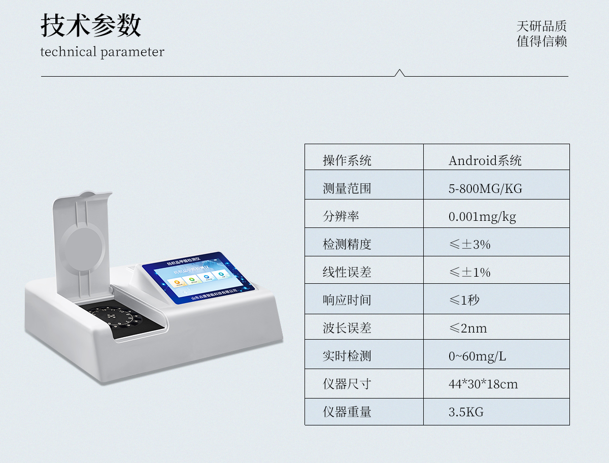 | 1、智能**且方便 | ①智能芯片:主控芯片采用ARM Cortex-A7,RK3288/4核處理器,搭配安卓智能操作系統(tǒng),集實(shí)驗(yàn)操作,分析結(jié)果,打印報(bào)告等功能于一體,使用方便,性能更強(qiáng)。 | ②大屏顯示:采用10.1英寸液晶觸摸屏,單機(jī)即可操作,無需連接外部顯示或控制器。 | ③多樣同檢:儀器具有12個(gè)檢測通道,可同時(shí)一次性檢測11個(gè)樣品,效率更高。 | ④工作預(yù)設(shè):具有任務(wù)預(yù)設(shè)模塊,一鍵提前預(yù)設(shè)樣品所有信息內(nèi)容。來樣時(shí)可直接檢測,同時(shí)可多次調(diào)取。 | ⑤數(shù)據(jù)分析:設(shè)備首頁自動(dòng)匯總分析數(shù)據(jù),并繪制柱形分析圖,各項(xiàng)檢測數(shù)據(jù)一目了然,快捷直觀。 | ⑥高度集成:模塊高度集合,將分光光度模塊、數(shù)字化管理模塊、無線通訊模塊集成于一體。可將檢測結(jié)果進(jìn)行分析,直接上傳至數(shù)據(jù)平臺,實(shí)現(xiàn)數(shù)據(jù)共享,方便后期進(jìn)行數(shù)據(jù)分析與統(tǒng)計(jì)。 | ⑦遠(yuǎn)程升級:儀器具備遠(yuǎn)程升級功能,可遠(yuǎn)程升級程序,無需返廠,并可持續(xù)性免費(fèi)更新系統(tǒng)版本,降低成本及運(yùn)輸損耗風(fēng)險(xiǎn)。 | 2、檢測精準(zhǔn)且直觀 | ①**技術(shù):精密旋轉(zhuǎn)比色池,使用同芯片同光源校準(zhǔn)精度,解決不同光源之間存在波長誤差的問題,更加準(zhǔn)確**。 | ②結(jié)果直觀:儀器自動(dòng)對檢測結(jié)果與國標(biāo)限量值進(jìn)行對比,自動(dòng)判定結(jié)果是否合格,結(jié)果更直觀。 | 3、功能強(qiáng)大且實(shí)用 | ①存儲(chǔ)功能:設(shè)備可以存儲(chǔ)數(shù)據(jù)100000組,可在屏幕上直觀查看歷史數(shù)據(jù),可導(dǎo)出數(shù)據(jù)。 | ②打印功能:設(shè)備自帶打印功能,可對樣品信息及檢測結(jié)果無限次隨意打印。 | ③全新方式:新創(chuàng)自定義打印方式,可按需靈活勾選控制:二維碼,抽樣信息、檢測信息,受檢信息、復(fù)核信息、抽樣日期、檢測日期等信息的打印 | ④多重編輯:樣品信息可多重編輯,可以對每個(gè)通道屬性和樣品信息單獨(dú)進(jìn)行編輯,例如樣品信息、抽樣信息、檢測信息,受檢信息、復(fù)核信息、抽樣日期、檢測日期等信息等。 | ⑤雙語設(shè)計(jì):全中文/英文操作菜單,簡單實(shí)用,適用于不同用戶的需求。 |