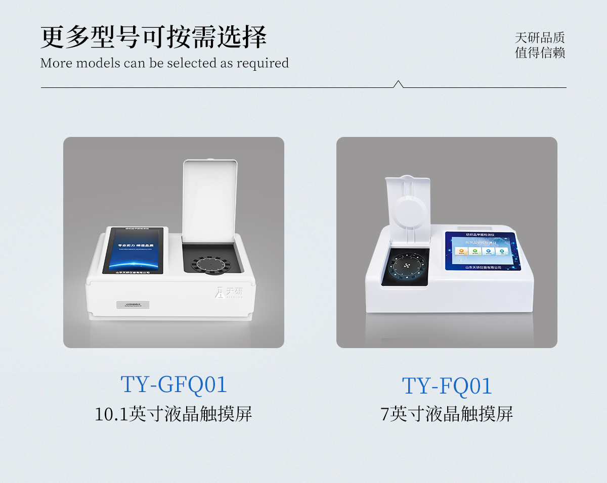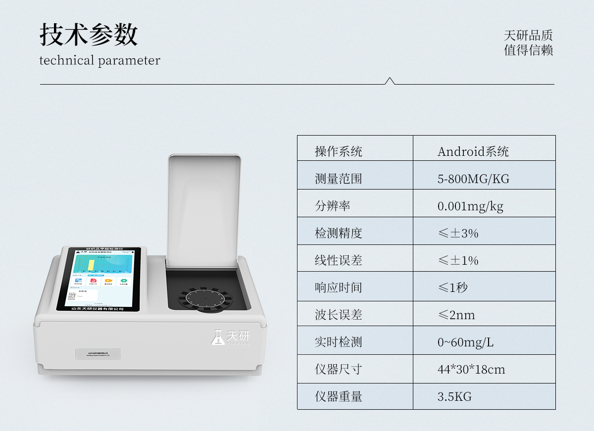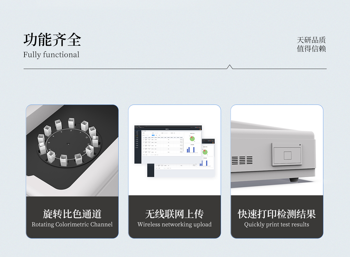 | 1、智能**且方便 | ①智能芯片:主控芯片采用ARM Cortex-A7,RK3288/4核處理器,搭配安卓智能操作系統(tǒng),集實驗操作,分析結(jié)果,打印報告等功能于一體,使用方便,性能更強。 | ②大屏顯示:采用10.1英寸液晶觸摸屏,單機即可操作,無需連接外部顯示或控制器。 | ③多樣同檢:儀器具有12個檢測通道,可同時一次性檢測11個樣品,效率更高。 | ④工作預(yù)設(shè):具有任務(wù)預(yù)設(shè)模塊,一鍵提前預(yù)設(shè)樣品所有信息內(nèi)容。來樣時可直接檢測,同時可多次調(diào)取。 | ⑤數(shù)據(jù)分析:設(shè)備首頁自動匯總分析數(shù)據(jù),并繪制柱形分析圖,各項檢測數(shù)據(jù)一目了然,快捷直觀。 | ⑥高度集成:模塊高度集合,將分光光度模塊、數(shù)字化管理模塊、無線通訊模塊集成于一體??蓪z測結(jié)果進行分析,直接上傳至數(shù)據(jù)平臺,實現(xiàn)數(shù)據(jù)共享,方便后期進行數(shù)據(jù)分析與統(tǒng)計。 | ⑦遠程升級:儀器具備遠程升級功能,可遠程升級程序,無需返廠,并可持續(xù)性免費更新系統(tǒng)版本,降低成本及運輸損耗風(fēng)險。 | 2、檢測精準(zhǔn)且直觀 | ①**技術(shù):精密旋轉(zhuǎn)比色池,使用同芯片同光源校準(zhǔn)精度,解決不同光源之間存在波長誤差的問題,更加準(zhǔn)確**。 | ②結(jié)果直觀:儀器自動對檢測結(jié)果與國標(biāo)限量值進行對比,自動判定結(jié)果是否合格,結(jié)果更直觀。 | 3、功能強大且實用 | ①存儲功能:設(shè)備可以存儲數(shù)據(jù)100000組,可在屏幕上直觀查看歷史數(shù)據(jù),可導(dǎo)出數(shù)據(jù)。 | ②打印功能:設(shè)備自帶打印功能,可對樣品信息及檢測結(jié)果無限次隨意打印。 | ③全新方式:新創(chuàng)自定義打印方式,可按需靈活勾選控制:二維碼,抽樣信息、檢測信息,受檢信息、復(fù)核信息、抽樣日期、檢測日期等信息的打印 | ④多重編輯:樣品信息可多重編輯,可以對每個通道屬性和樣品信息單獨進行編輯,例如樣品信息、抽樣信息、檢測信息,受檢信息、復(fù)核信息、抽樣日期、檢測日期等信息等。 | ⑤雙語設(shè)計:全中文/英文操作菜單,簡單實用,適用于不同用戶的需求。 |