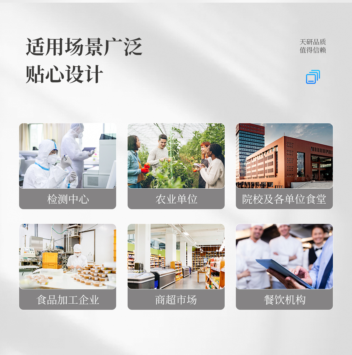 | 安卓智能操作系統(tǒng),采用更加**UI交互界面,儀器具有wifi聯(lián)網(wǎng)上傳、4G聯(lián)網(wǎng)傳輸、GPRS無線遠(yuǎn)傳、網(wǎng)線連接功能,快速批量上傳數(shù)據(jù)。 | 智能化程度高,儀器具有自檢功能:具有開機(jī)自檢和調(diào)零功能,具有自動(dòng)檢測(cè)重復(fù)性功能。 | 新一代高速熱敏打印機(jī),檢測(cè)完成可自動(dòng)打印或批量打印檢測(cè)報(bào)告和二維碼。 | 儀器帶有監(jiān)管平臺(tái),數(shù)據(jù)可局域網(wǎng)和互聯(lián)網(wǎng)數(shù)據(jù)上傳,檢測(cè)結(jié)果直接傳至食品安全監(jiān)管平臺(tái)。進(jìn)行區(qū)域食品安全監(jiān)管及大數(shù)據(jù)分析處理與數(shù)據(jù)統(tǒng)計(jì),檢測(cè)區(qū)域食品安全長(zhǎng)短期動(dòng)態(tài),達(dá)到食品安全問題預(yù)估、預(yù)警 | 一體化主機(jī),包含光電比色檢測(cè)模塊、膠體金免疫層析檢測(cè)模塊。 | 一體化便攜式快檢設(shè)備,滿足現(xiàn)場(chǎng)及流動(dòng)檢測(cè)使用需求,能夠在同一軟件下實(shí)現(xiàn)所有檢測(cè)項(xiàng)目的檢測(cè),并可通過同一窗口直觀顯示檢測(cè)結(jié)果。 | 膠體金模塊檢測(cè)方式:軌道式自動(dòng)傳輸掃描,檢測(cè)完成后自動(dòng)退出檢測(cè)卡。 | CT線自動(dòng)識(shí)別,無需手動(dòng)調(diào)整。 | 儀器具有多品類多種類樣品菜單庫,可靈活選擇檢測(cè)樣品,不同的檢測(cè)通道可同時(shí)檢測(cè)不同的樣品項(xiàng)目。也可在儀器上直接編輯錄入樣品名稱、檢測(cè)指標(biāo)、送檢單位等信息并保存進(jìn)樣品數(shù)據(jù)庫。 | 儀器內(nèi)置操作視頻,是您身邊的化驗(yàn)指導(dǎo)專家。 | 樣品處理簡(jiǎn)單省力,整體操作快速、安全、便捷。 | 儀器具有自身保護(hù)功能,可設(shè)置用戶名及密碼,防止非工作人員操作等。 | 高靈敏度,高檢測(cè)精度,高重復(fù)性精度,掃描式高精度光學(xué)傳感器。 | 儀器具有重新校準(zhǔn)、鎖定、恢復(fù)出廠設(shè)置功能。 | 結(jié)果判定線可修改,對(duì)照值標(biāo)定值可保存,斷電不丟失數(shù)據(jù)。 | 兼容市場(chǎng)上所有的膠體金卡,使用耗材不受限制,極大增強(qiáng)用戶使用體驗(yàn)。 |