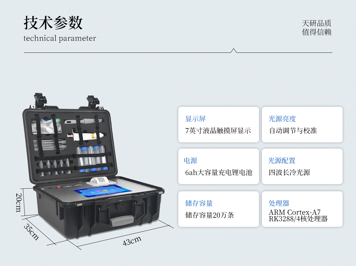 | 主控芯片采用ARM Cortex-A7,RK3288/4核處理器,主頻1.88Ghz,運轉速度更快速,穩(wěn)定性更強。 | 顯示方式:7英寸液晶觸摸屏顯示,人性化中文操作界面,讀數(shù)直觀、簡單。 | 交直流兩用,直流12V供電,可連接車載電源,可配6ah大容量充電鋰電池,方便戶外流動測試。 | 光源亮度自動調節(jié)與校準 | 智能恒流穩(wěn)壓,光強自動校準,長時間連續(xù)工作光源無溫漂現(xiàn)象。 | 內(nèi)置新國家限量標準,與所測結果進行現(xiàn)場比對,并持續(xù)更新標準。 | 不間斷進樣,連續(xù)檢測 | 樣本編號自動累加。 | 檢測項目可擴充。 | 檢測結果可批量打印,批量上傳。 | 檢測結果為Excel表格,連接電腦即可拷貝。 | 檢測結果存儲容量20萬條 | 標準USB接口,免驅動安裝。 | 固件可升級 |