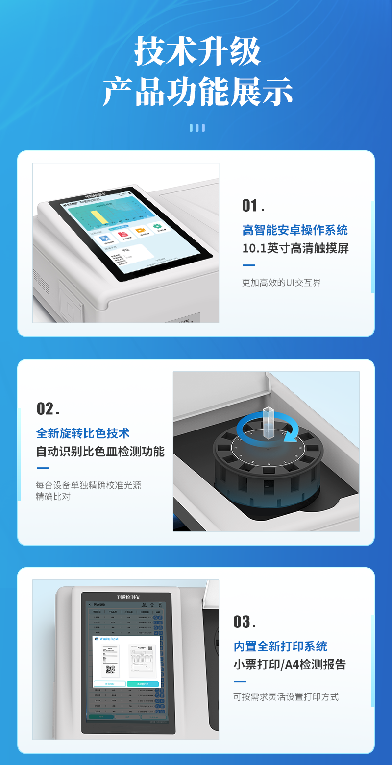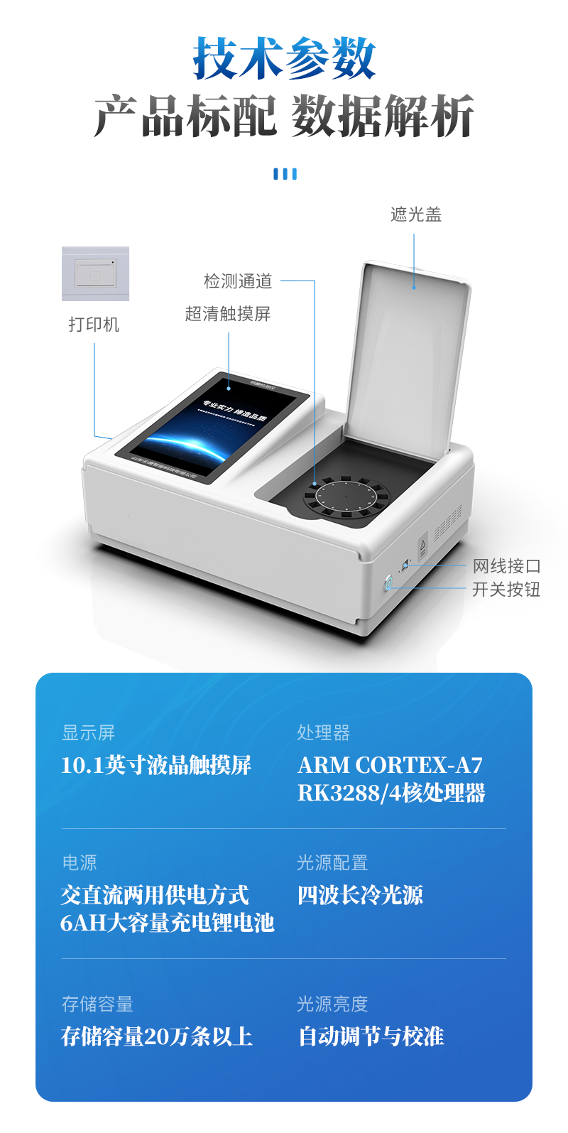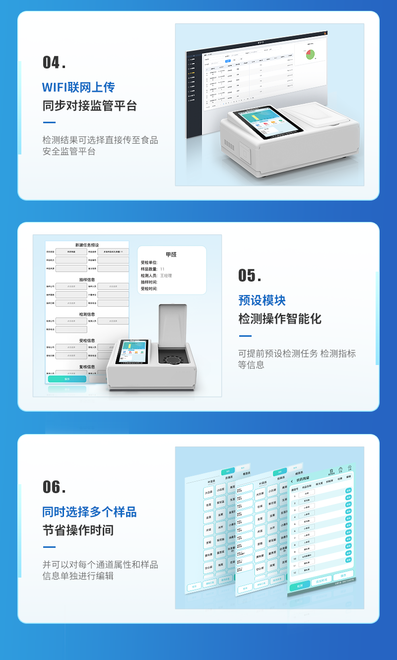 | 儀器采用臺式一體化系統(tǒng)檢測技術(shù),將分光光度模塊、新型農(nóng)殘檢測模塊、數(shù)字化管理模塊、無線通訊模塊高度集成于一體,支持檢測200種食品安全檢測項目,同時預(yù)留升級檢測方法。 | 儀器檢測模塊標(biāo)準(zhǔn)化、智能化,可隨意自由組合。檢測箱體內(nèi)置多個標(biāo)準(zhǔn)檢測單元,檢測模塊可以調(diào)整配置。 | 儀器采用全新安卓智能系統(tǒng),主控芯片采用 ARM Cortex-A7,RK3288/4核處理器,10.1寸高清液晶觸摸豎屏,更加**的UI交互界面,運轉(zhuǎn)快捷;儀器配備無線通信模塊: 4G(APN)通訊模塊、Wifi模塊,藍牙傳輸,同時具有雙USB接口以及RJ45接口能以多種方式實現(xiàn)數(shù)據(jù)保存和數(shù)據(jù)傳輸功能。 | 創(chuàng)新檢測模式: | ★檢測通道:≥12通道;采用精密旋轉(zhuǎn)比色池設(shè)計,使用同芯片同光源校準(zhǔn)精度,解決不同光源之間的誤差值。1-12通道間誤差0.1%。(**號:ZL202022821055.2) | ★儀器具有自動識別比色皿檢測功能,即:將樣品比色皿放入儀器后,點擊樣品檢測,儀器自動識別比色皿進行通道檢測。 | 進口高精光源: | 高精度進口四波長冷光源,通道配置 410、520、590、630nm 波長光源,一個光源芯片驅(qū)動一個光源,誤差極小,每臺設(shè)備單獨**校準(zhǔn)光源,**比對,同時參照四種不同波段光源全方位覆蓋市面上99%的農(nóng)殘食品項目檢測。 | 智能化操作系統(tǒng): | 便捷操作系統(tǒng):設(shè)備檢測時可在同一檢測界面自動對應(yīng)相關(guān)檢測通道一次性選擇1-12個樣品名稱,無須退出界面,節(jié)省操作時間。 | 數(shù)據(jù)集成系統(tǒng):設(shè)備首頁自動統(tǒng)計檢測數(shù)據(jù)包含:周檢測數(shù)據(jù)、月檢測數(shù)據(jù),全部檢測總數(shù)量,均包含檢測總數(shù),合格數(shù),不合格數(shù),以及相關(guān)柱形分析圖,對各項檢測數(shù)據(jù)清晰掌握,無需電腦查詢,更加快捷直觀。 | 項目預(yù)設(shè)系統(tǒng):支持添加單個及多個相同或不相同的任務(wù)預(yù)設(shè),一鍵快速調(diào)取,每一個任務(wù)分別可以設(shè)置不同的樣品、批次、編號、來源、備注、抽樣信息、檢測信息、受檢信息、復(fù)核信息等更多信息。無縫鏈接平臺和APP實時查看下發(fā)任務(wù)。 | 數(shù)據(jù)監(jiān)管系統(tǒng):同步對接監(jiān)管平臺,數(shù)據(jù)可局域網(wǎng)和互聯(lián)網(wǎng)數(shù)據(jù)上傳,檢測結(jié)果可選擇直接傳至食品安全監(jiān)管平臺。集成OSS輸出存儲服務(wù)、區(qū)分設(shè)備定向管理應(yīng)用,進行區(qū)域食品安全監(jiān)管及大數(shù)據(jù)分析處理與數(shù)據(jù)統(tǒng)計,檢測區(qū)域食品安全長短期動態(tài),達到食品安全問題預(yù)估、預(yù)警。 | 自定義打印系統(tǒng):內(nèi)置全新打印系統(tǒng),新創(chuàng)自定義打印方式,可按需靈活設(shè)置開啟或關(guān)閉:產(chǎn)品合格證(國家農(nóng)業(yè)部標(biāo)準(zhǔn)要求),二維碼,抽樣信息、檢測信息,受檢信息、復(fù)核信息、抽樣日期、檢測日期等信息的打印。 | 系統(tǒng)遠程更新功能:可定向分客戶分儀器更新系統(tǒng),按照不同客戶后期實際需求添加項目,無需機器返廠,即可遠程實時升級全新系統(tǒng),節(jié)省時間成本及避免運輸造成設(shè)備損壞。 | 儀器主機采用一體化防水、抗壓、防撞擊、防腐蝕箱體設(shè)計,同時配備交直流供電,可連接車載電源,可選配大容量充電鋰電池,滿足現(xiàn)場野外檢測需求。 | 安全證書,放心保障:儀器具有中國計量科學(xué)研究院校準(zhǔn)證書,**認證。 |