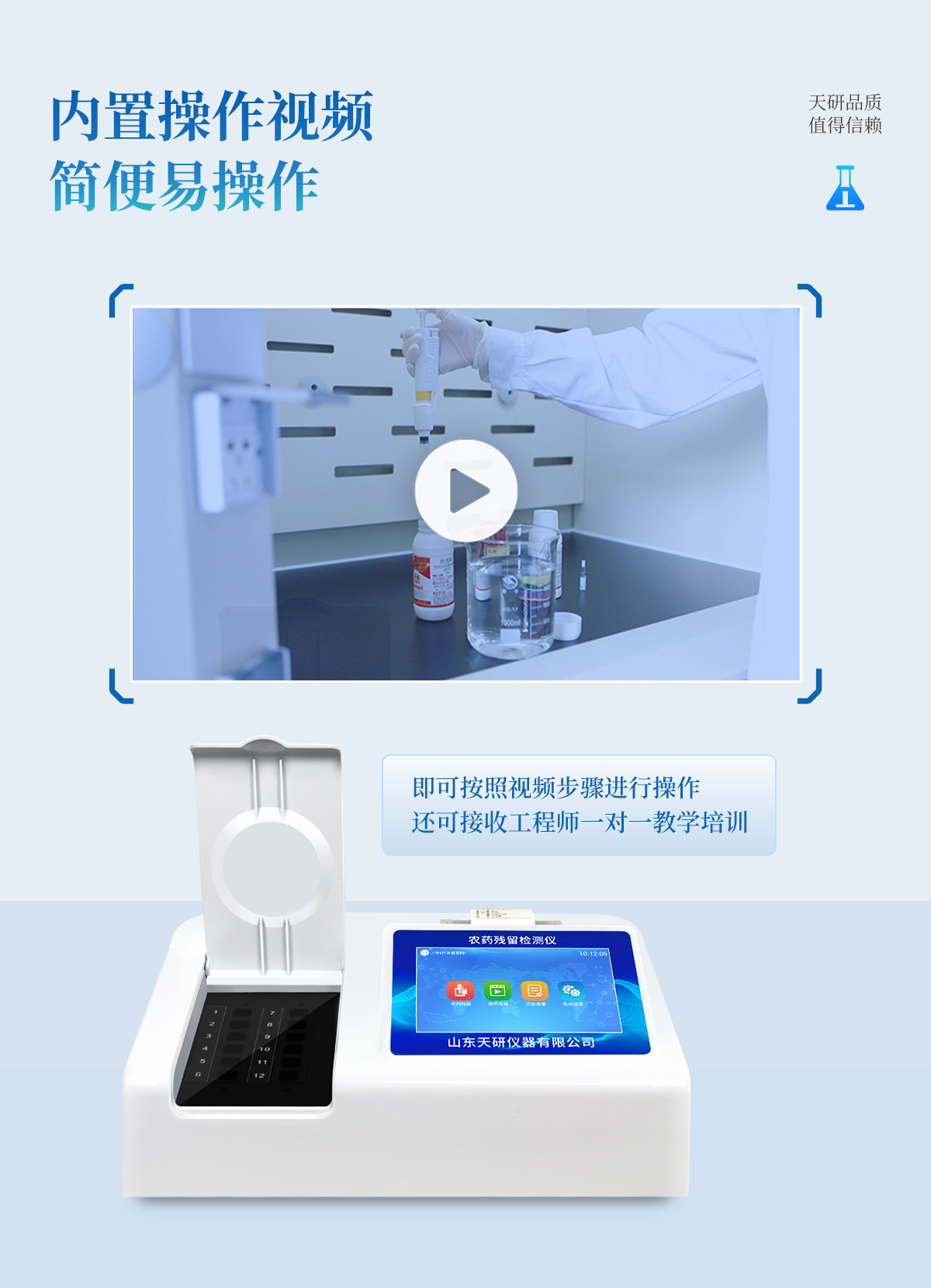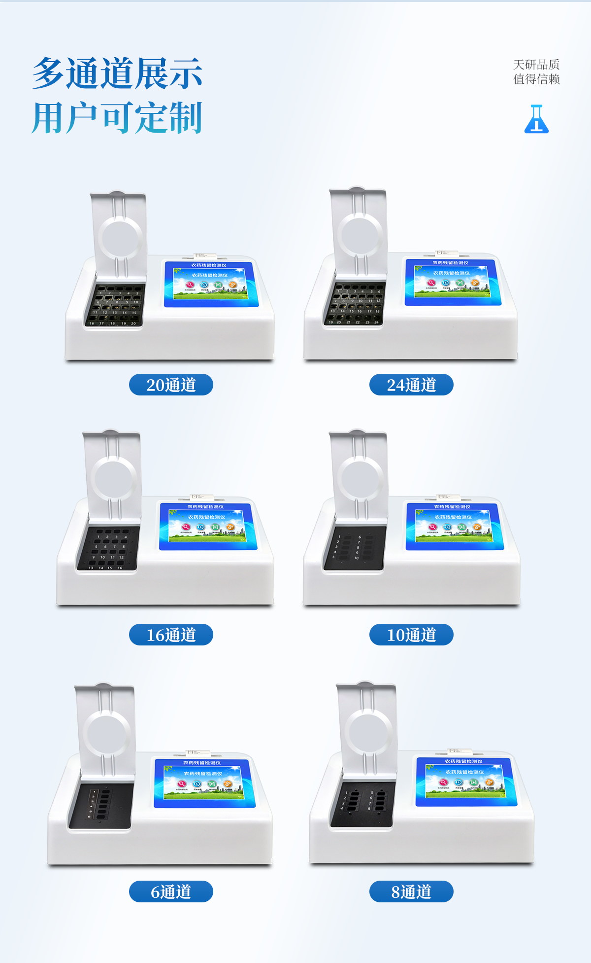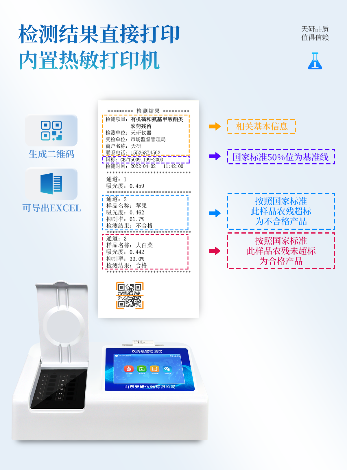 | 乙酰膽堿酯酶和丁酰膽堿酯酶試劑均可以使用,符合國家標(biāo)準(zhǔn)和農(nóng)業(yè)部標(biāo)準(zhǔn)的要求。 | 自動判斷樣品是否合格,檢測結(jié)果更加直觀。 | 儀器具有100多種蔬菜名稱菜單庫,分類管理,并可按需添加或刪除蔬菜名,編輯蔬菜名稱,可直接打印出蔬菜名稱。 | 檢測通道:12個檢測通道,可以同時測試多個樣品,循環(huán)檢測,即放即檢,每個樣品由程序控制分別獨立工作,不會互相干擾。 | 智能操作系統(tǒng),采用更加人性化操作,主控采用多核處理器,主頻1.88Ghz,運轉(zhuǎn)速度更快速,穩(wěn)定性更強。 | 顯示方式:7英寸高靈敏真彩觸摸屏顯示,人性化中文操作界面,讀數(shù)直觀、簡單。 | 打印機采用串口5v打印,可選擇手動打印或者自動打印,三分鐘出打印結(jié)果,打印格式為檢測人姓名、吸光度差值、檢測時間、檢測機構(gòu)、樣品名稱及結(jié)果判定。 | 光源采用進(jìn)口超高亮發(fā)光二極管,具有低功耗、高精度、穩(wěn)定性強、光源可控可以關(guān)掉不使用的光源,響應(yīng)速度快等優(yōu)點。 | 智能恒流穩(wěn)壓,光強自動校準(zhǔn),長時間連續(xù)工作光源無溫漂現(xiàn)象。 | 儀器具有GPRS遠(yuǎn)傳功能,可插手機卡實現(xiàn)數(shù)據(jù)遠(yuǎn)傳平臺,wifi聯(lián)網(wǎng)功能,可將數(shù)據(jù)快速上傳電腦,進(jìn)行數(shù)據(jù)管理與統(tǒng)計。 | 采用USB2.0接口設(shè)計,方便數(shù)據(jù)的存貯和移動,并可隨時與計算機直接相連,并且可用計算機控制儀器。實現(xiàn)數(shù)據(jù)查詢、瀏覽、分析、統(tǒng)計、打印等。 | 智能化程度高,儀器具有自檢功能:具有開機自檢和調(diào)零功能,具有自動檢測重復(fù)性功能 | 儀器具有自身保護(hù)功能,可設(shè)置用戶名及密碼,防止非工作人員操作等。 | 采用DC12v直流供電,安全系統(tǒng)更高,并且配備6A鋰電池充電器。 | 儀器具有重新校準(zhǔn)、鎖定、恢復(fù)出廠設(shè)置功能。 |