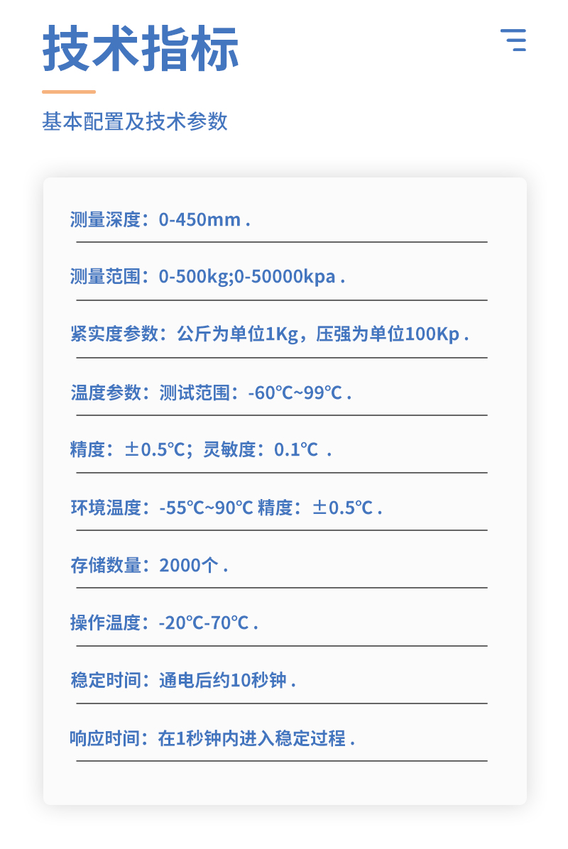 土壤緊實(shí)度由土壤抗剪力、壓縮力和摩擦力等構(gòu)成。是土壤強(qiáng)度的一個合成指標(biāo)。金屬柱塞或探針壓入土壤時分動載和靜載兩種方法,不同方法的測定值不同,但有聯(lián)系。柱塞的形狀有錐體、平頭、圓球及楔子等,這些對測定值也有影響。對同一種方法的測定值,主要決定于土壤質(zhì)地、容重和含水量。其中含水量的影響**。土壤緊實(shí)度可預(yù)測土壤承載量、耕性和根系伸展的阻力。土壤緊實(shí)度的大小可影響作物根系的穿孔和生長,是一個重要的土壤物理特性指標(biāo),用于評價土壤耕性。緊實(shí)的土壤可阻止水分的入滲,降低化肥的利用率,影響植物根系生長,導(dǎo)致作物減產(chǎn)。