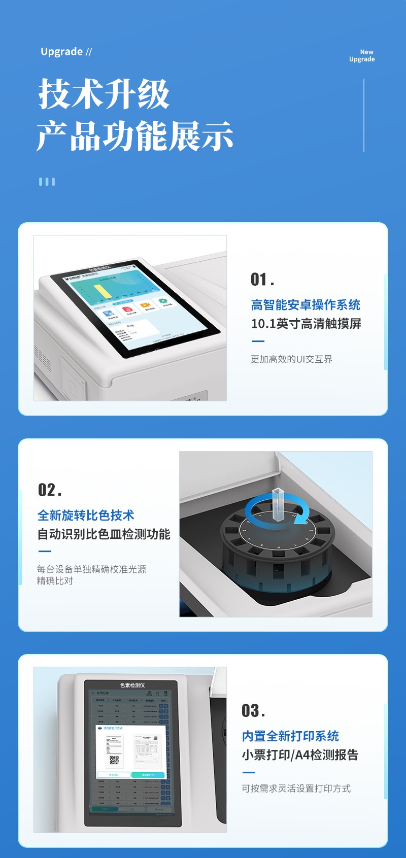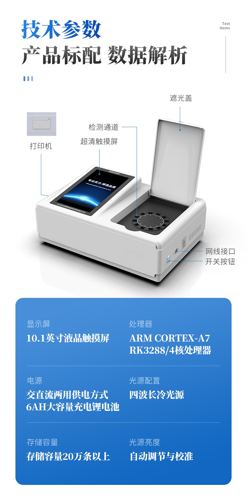 | 儀器采用臺式一體化系統(tǒng)檢測技術(shù),將分光光度模塊、新型農(nóng)殘檢測模塊、數(shù)字化管理模塊、無線通訊模塊高度集成于一體,支持檢測200種食品安全檢測項目,同時預(yù)留升級檢測方法。 | 儀器檢測模塊標(biāo)準(zhǔn)化、智能化,可隨意自由組合。檢測箱體內(nèi)置多個標(biāo)準(zhǔn)檢測單元,檢測模塊可以調(diào)整配置。 | 儀器采用全新安卓智能系統(tǒng),主控芯片采用 ARM Cortex-A7,RK3288/4核處理器,10.1寸高清液晶觸摸豎屏,更加**的UI交互界面,運轉(zhuǎn)快捷;儀器配備無線通信模塊: 4G(APN)通訊模塊、Wifi模塊,藍(lán)牙傳輸,同時具有雙USB接口以及RJ45接口能以多種方式實現(xiàn)數(shù)據(jù)保存和數(shù)據(jù)傳輸功能。 | 創(chuàng)新檢測模式: | ★檢測通道:≥12通道;采用精密旋轉(zhuǎn)比色池設(shè)計,使用同芯片同光源校準(zhǔn)精度,解決不同光源之間的誤差值。1-12通道間誤差0.1%。(**號:ZL202022821055.2) | ★儀器具有自動識別比色皿檢測功能,即:將樣品比色皿放入儀器后,點擊樣品檢測,儀器自動識別比色皿進(jìn)行通道檢測。 | 進(jìn)口高精光源: | 高精度進(jìn)口四波長冷光源,通道配置 410、520、590、630nm 波長光源,一個光源芯片驅(qū)動一個光源,誤差極小,每臺設(shè)備單獨**校準(zhǔn)光源,**比對,同時參照四種不同波段光源全方位覆蓋市面上99%的農(nóng)殘食品項目檢測。 | 智能化操作系統(tǒng): | 便捷操作系統(tǒng):設(shè)備檢測時可在同一檢測界面自動對應(yīng)相關(guān)檢測通道一次性選擇1-12個樣品名稱,無須退出界面,節(jié)省操作時間。 | 數(shù)據(jù)集成系統(tǒng):設(shè)備首頁自動統(tǒng)計檢測數(shù)據(jù)包含:周檢測數(shù)據(jù)、月檢測數(shù)據(jù),全部檢測總數(shù)量,均包含檢測總數(shù),合格數(shù),不合格數(shù),以及相關(guān)柱形分析圖,對各項檢測數(shù)據(jù)清晰掌握,無需電腦查詢,更加快捷直觀。 | 項目預(yù)設(shè)系統(tǒng):支持添加單個及多個相同或不相同的任務(wù)預(yù)設(shè),一鍵快速調(diào)取,每一個任務(wù)分別可以設(shè)置不同的樣品、批次、編號、來源、備注、抽樣信息、檢測信息、受檢信息、復(fù)核信息等更多信息。無縫鏈接平臺和APP實時查看下發(fā)任務(wù)。 | 數(shù)據(jù)監(jiān)管系統(tǒng):同步對接監(jiān)管平臺,數(shù)據(jù)可局域網(wǎng)和互聯(lián)網(wǎng)數(shù)據(jù)上傳,檢測結(jié)果可選擇直接傳至食品安全監(jiān)管平臺。集成OSS輸出存儲服務(wù)、區(qū)分設(shè)備定向管理應(yīng)用,進(jìn)行區(qū)域食品安全監(jiān)管及大數(shù)據(jù)分析處理與數(shù)據(jù)統(tǒng)計,檢測區(qū)域食品安全長短期動態(tài),達(dá)到食品安全問題預(yù)估、預(yù)警。 | 自定義打印系統(tǒng):內(nèi)置全新打印系統(tǒng),新創(chuàng)自定義打印方式,可按需靈活設(shè)置開啟或關(guān)閉:產(chǎn)品合格證(國家農(nóng)業(yè)部標(biāo)準(zhǔn)要求),二維碼,抽樣信息、檢測信息,受檢信息、復(fù)核信息、抽樣日期、檢測日期等信息的打印。 | 系統(tǒng)遠(yuǎn)程更新功能:可定向分客戶分儀器更新系統(tǒng),按照不同客戶后期實際需求添加項目,無需機器返廠,即可遠(yuǎn)程實時升級全新系統(tǒng),節(jié)省時間成本及避免運輸造成設(shè)備損壞。 | 儀器主機采用一體化防水、抗壓、防撞擊、防腐蝕箱體設(shè)計,同時配備交直流供電,可連接車載電源,可選配大容量充電鋰電池,滿足現(xiàn)場野外檢測需求。 | 安全證書,放心保障:儀器具有中國計量科學(xué)研究院校準(zhǔn)證書,**認(rèn)證。 |