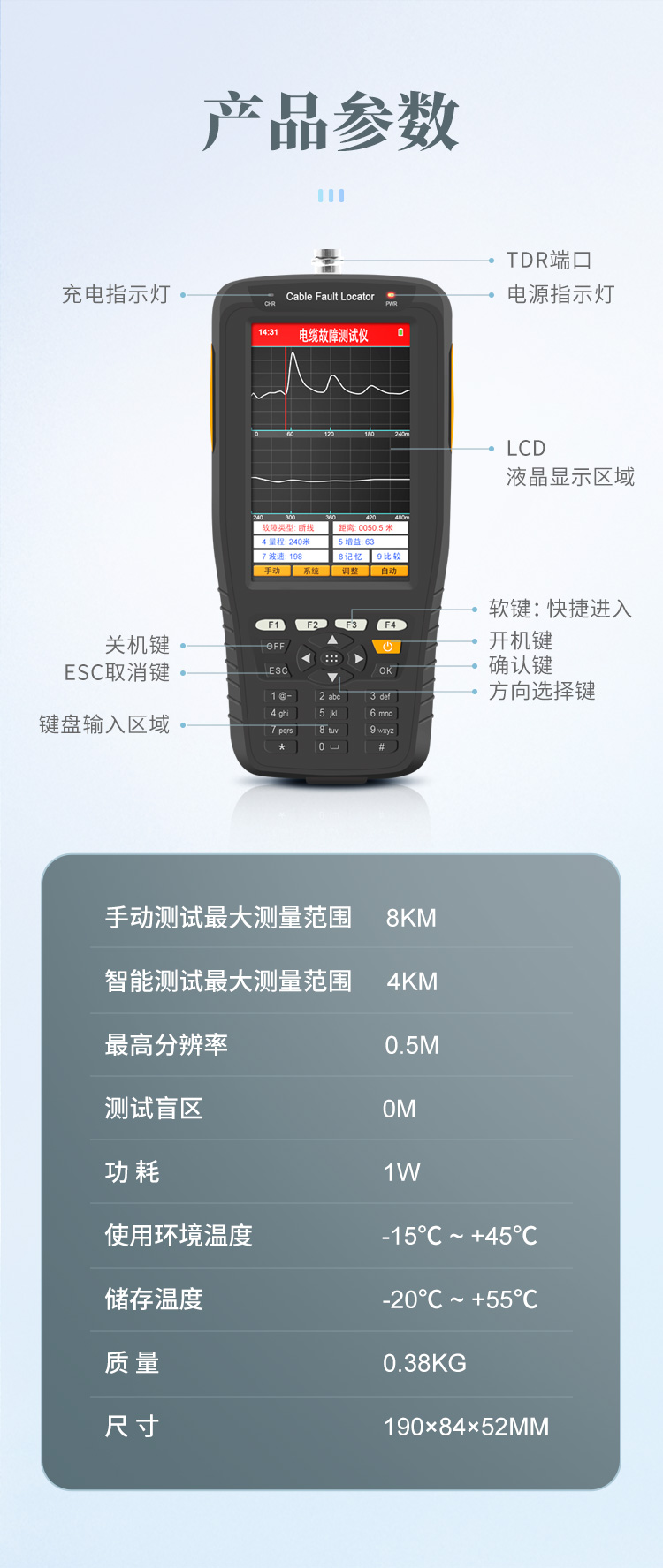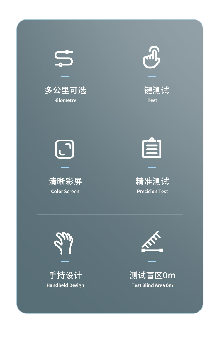 | 手動(dòng)測(cè)試**測(cè)量范圍 8Km | 智能測(cè)試**測(cè)量范圍 4Km | **分辨率 0.5m | 測(cè)試盲區(qū) 0m | 功耗 1W | 質(zhì)量 0.38KG | 體積 190×84×52mm3 | 使用環(huán)境溫度 -15℃ ~ +45℃ | 儲(chǔ)存溫度 -20℃ ~ +55℃ |
