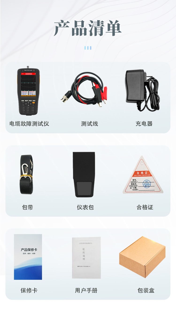 | 電纜故障測(cè)試儀......1 | 測(cè)試線X......1 | 充電器......1 | 包帶......1 | 儀表包......1 | 合格證......1 | 保修卡......1 | 用戶(hù)手冊(cè)......1 | 包裝盒......1 |