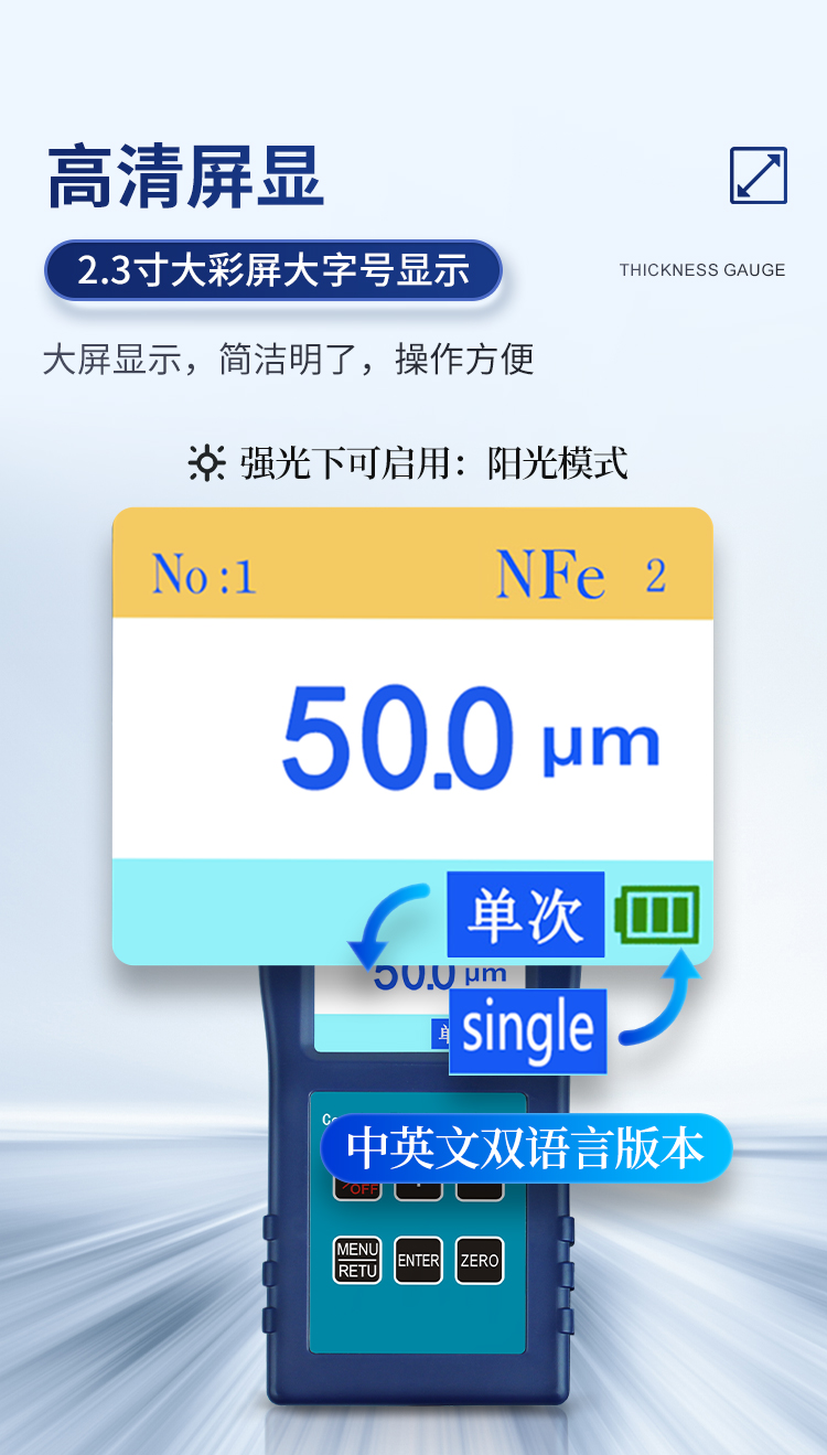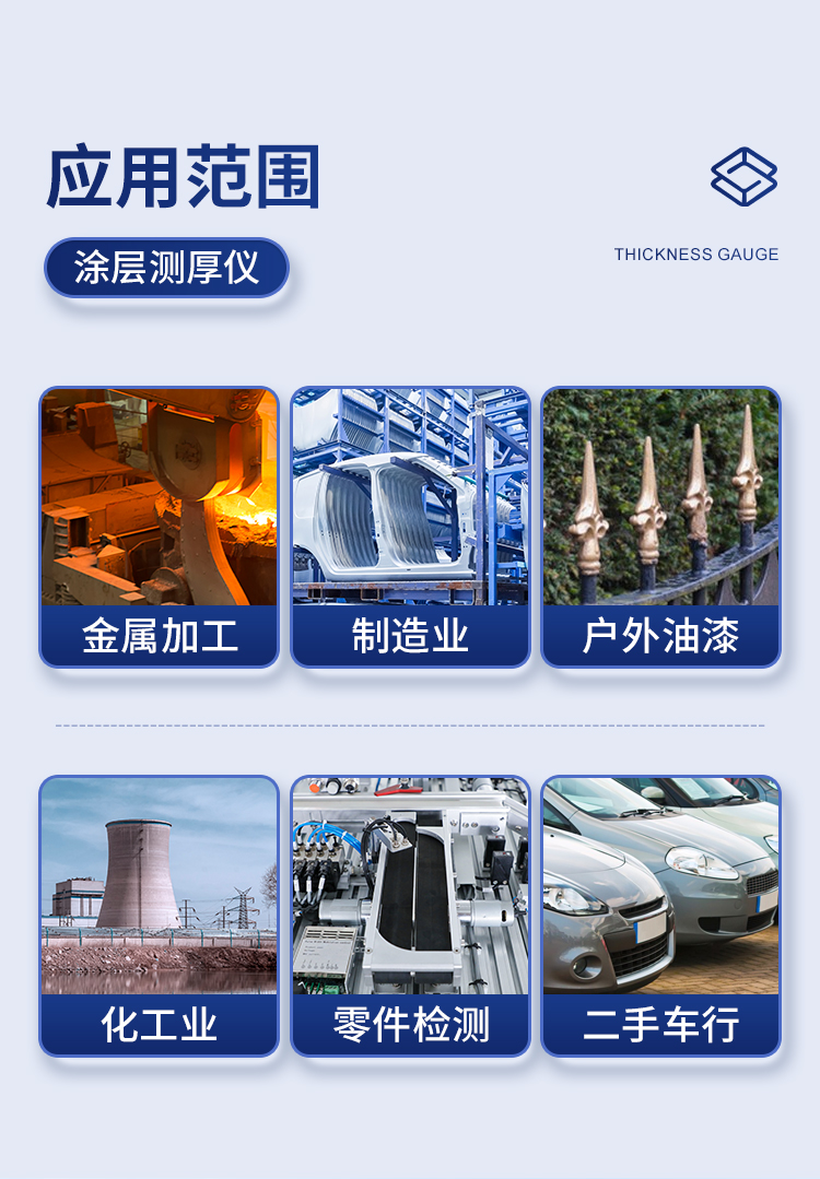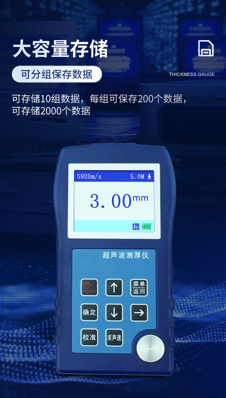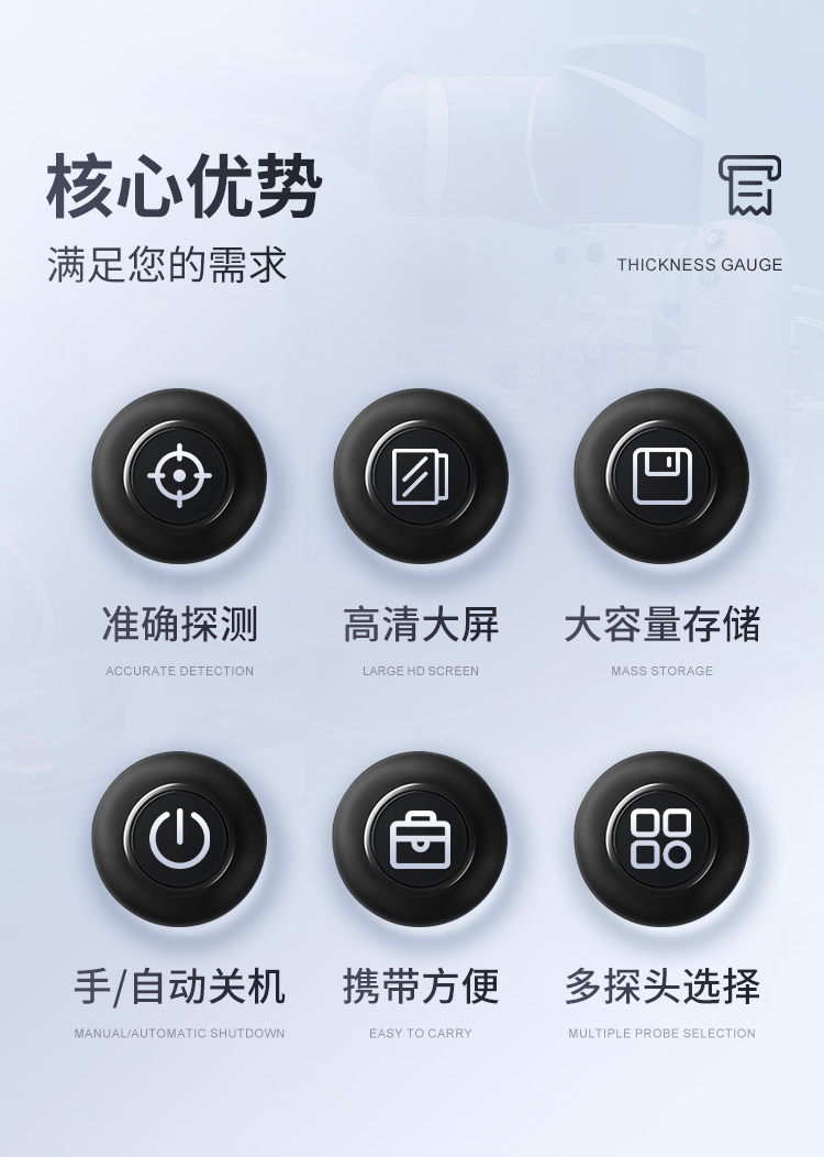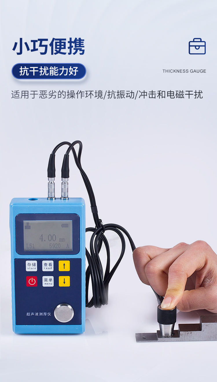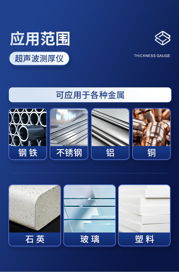 適用于各種材料的高精度厚度測量需求,可應(yīng)用于各種金屬(鋼鐵、不銹鋼、鋁、銅、等)石英、玻璃、塑料等材質(zhì)的被測物體厚度測量。 只需要將探頭放置于被測物體一側(cè)的接觸面上,既可以迅速準(zhǔn)確測量出被測物體厚度。