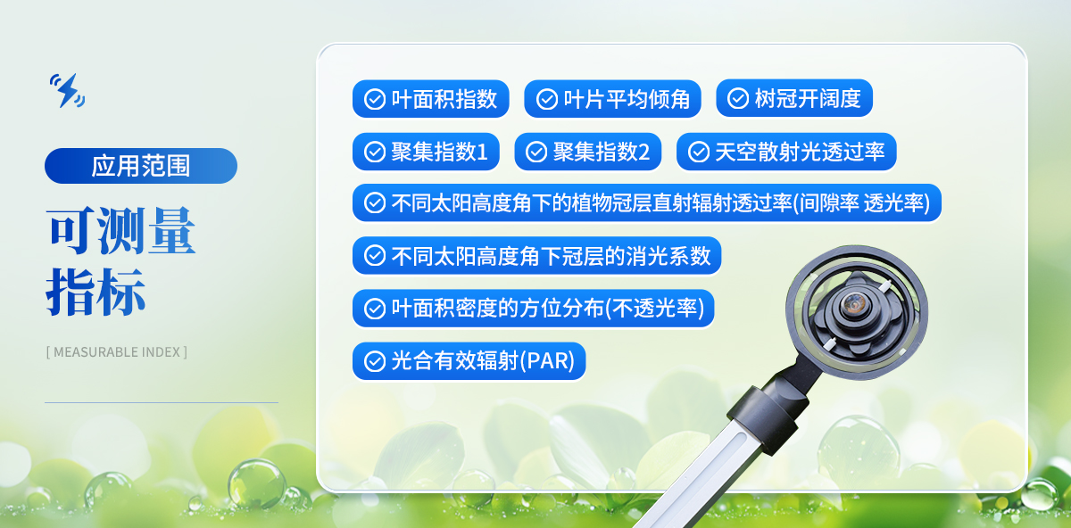 | 1.鏡頭角度:150° | 2.分辨率:768×494 | 3.測(cè)量范圍:天頂角由0°~75°(150°魚眼鏡頭)可分割成十個(gè)區(qū)域,方位角360°亦可分割成十個(gè)區(qū)域 | 4.PAR感應(yīng)范圍:感應(yīng)光譜400nm~700nm | 5.測(cè)量范圍0~2000μmol/㎡?S | 6.實(shí)時(shí)顯示GPS衛(wèi)星定位經(jīng)緯度,明確當(dāng)前檢測(cè)位置 | 7.檢測(cè)結(jié)果可直接傳至專屬云農(nóng)業(yè)數(shù)據(jù)中心,配備專屬云農(nóng)業(yè)數(shù)據(jù)中心賬戶 | 8.分析軟件:植物冠層分析系統(tǒng) | 9.探頭尺寸:直徑6cm,高10cm | 10.總 重 量:500克(不含筆記本電腦) | 11.傳輸接口:USB | 12.工作溫度:0~55℃ |