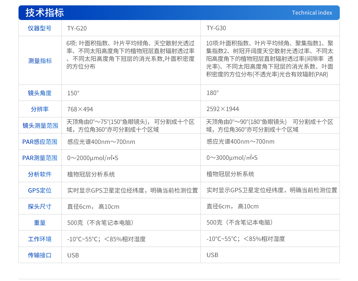 | 鏡頭角度:150° | 分辨率:768×494pix | 測量范圍:天頂角由0°~75°(150°魚眼鏡頭)可分割成十個(gè)區(qū)域,方位角360°亦可分割成十個(gè)區(qū)域 | PAR感應(yīng)范圍:感應(yīng)光譜400nm~700nm | 測量范圍0~2000μmol/㎡?S | 分析軟件:植物冠層分析系統(tǒng) | 電 源:8.4v可充電鋰電池組 | 探頭尺寸:直徑6cm,高10cm | 總 重 量:500克(不含筆記本電腦) | 傳輸接口:USB | 工作溫度:0~55℃ |