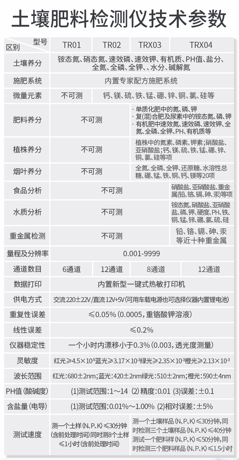 | 土壤氮磷鉀誤差≤1%,有機(jī)質(zhì)誤差≤2%,微量元素相對(duì)誤差≤5%;肥料單項(xiàng)誤差≤0.5%,氮磷鉀三項(xiàng)誤差≤1%。 |