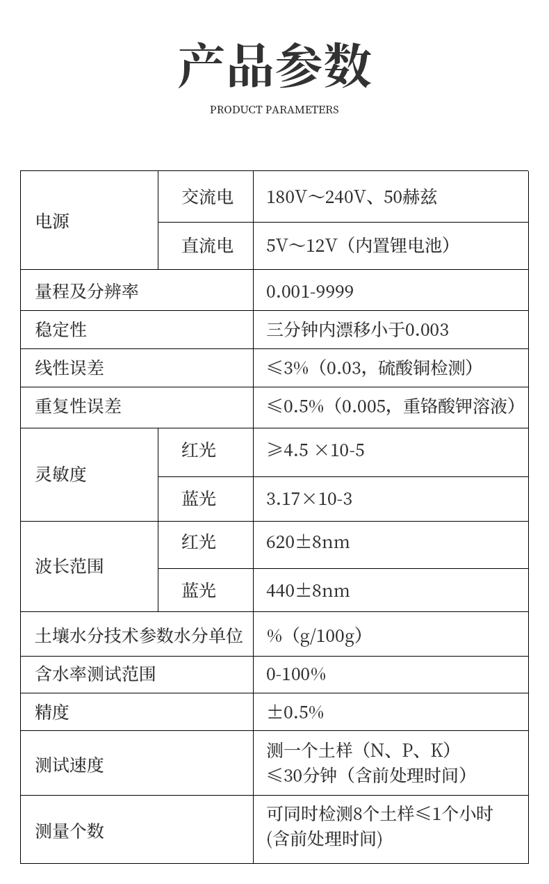 | 1.電源:交直流兩用,交流電:180V~240V、50赫茲;直流電:5V~12V(內(nèi)置鋰電池) | 2.量程及分辨率:0.001-9999 | 3.穩(wěn)定性:三分鐘內(nèi)漂移小于0.003 | 4.線性誤差:≤3%(0.03,硫酸銅檢測) | 5.重復(fù)性誤差:≤0.5%(0.005,重鉻酸鉀溶液) | 6.靈敏度:紅光≥4.5 ×10-5 藍光≥3.17×10-3 | 7.波長范圍:紅光620±8nm 藍光440±8nm | 8.土壤水分技術(shù)參數(shù)水分單位:%(g/100g)含水率測試范圍:0-100% 精度:±0.5% | 9.土壤中速效N、P、K三種養(yǎng)分一次性同時浸提測定、科學(xué)指導(dǎo)施肥 | 10.肥料中氮(N)、磷(P)、鉀(K)等養(yǎng)分同時、快速、準(zhǔn)確檢測 | 11.測試速度:測一個土樣(N、P、K)≤30分鐘(含前處理時間) | 12.可同時檢測8個土樣≤1個小時(含前處理時間) | 13.數(shù)據(jù)打?。簝?nèi)置一鍵式熱敏打印機(國內(nèi)率先**設(shè)計) | 14.儀器尺寸:492*305*165mm |