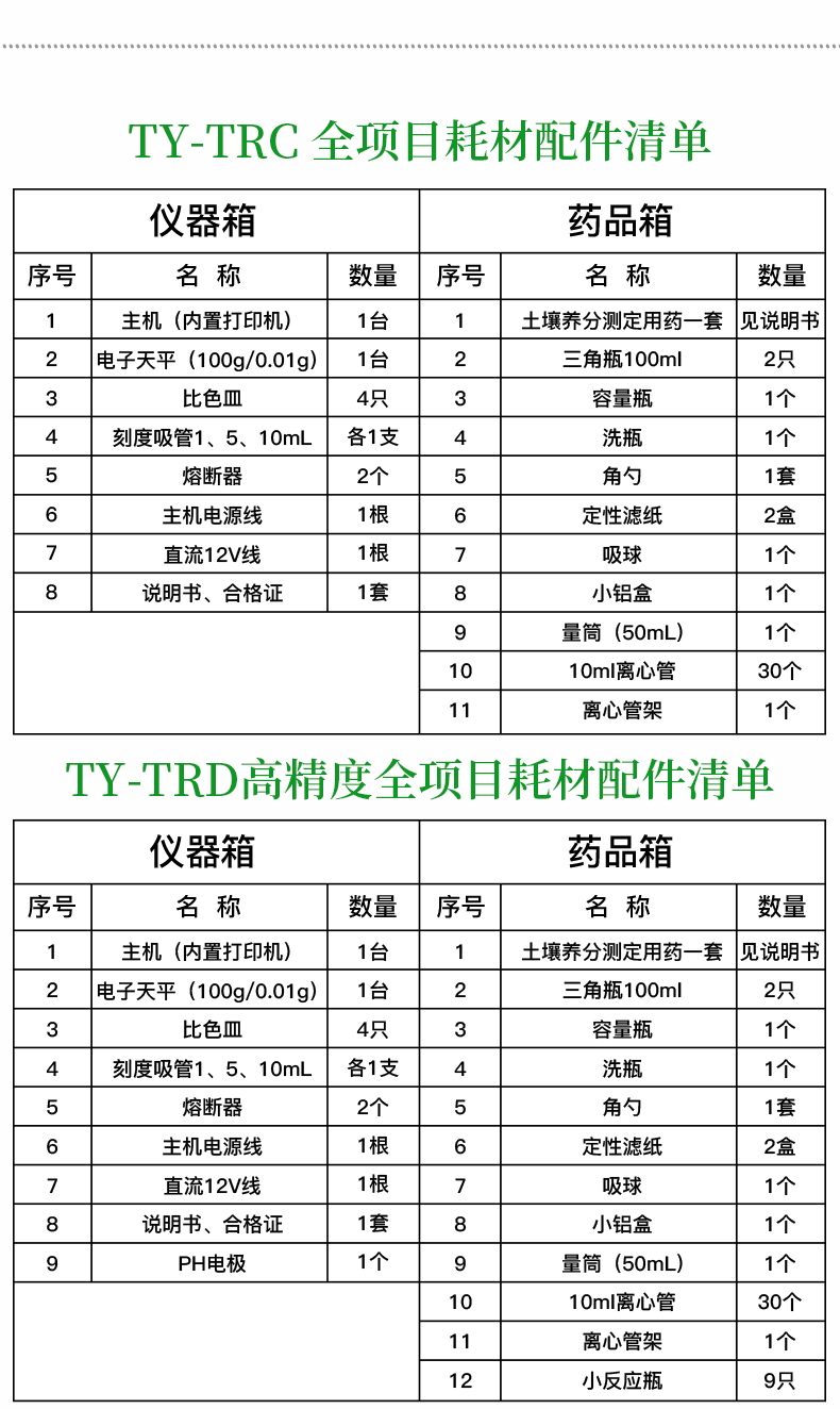 | 主機(內(nèi)置打印機) 1臺 | 比色皿 4只 | 電子天平(100g/0.01g) 1臺 | 電源適配器 1個 | 吸管(3mL) 12支 | 洗瓶 1個 | 稱樣勺 1套 | 定性濾紙 1盒 | 小鋁盒 1個 | 容量瓶 1個 | 量筒(50mL) 1個 | 浸提瓶 2個 | 反應(yīng)試管 18個 | 土壤養(yǎng)分測定試劑 1套 | 說明書、合格證、保修卡 1套 |