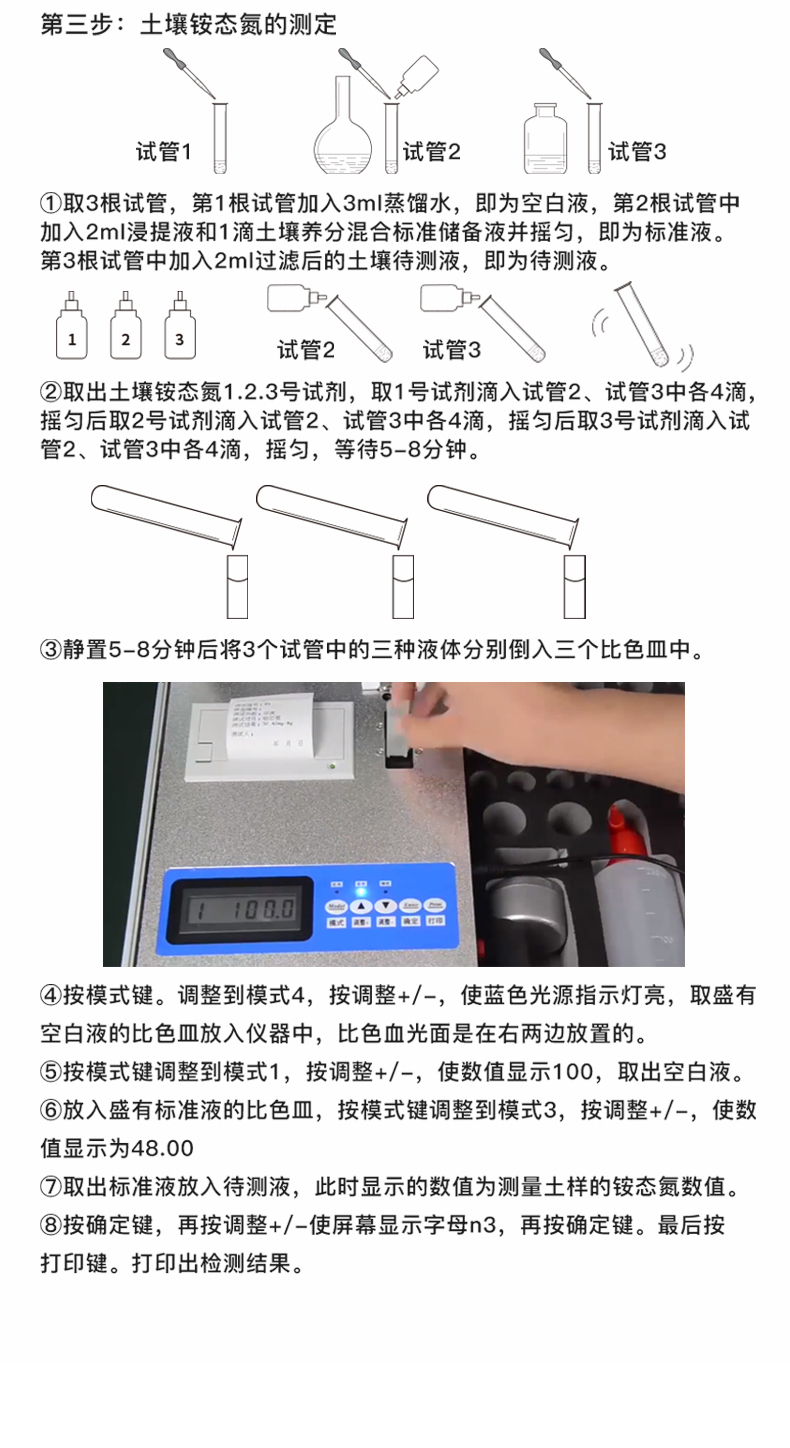 | 土壤養(yǎng)分:● 銨態(tài)氮、速效磷、速效鉀、水份、有機質(zhì)、酸堿度(pH試紙法)等項; | 肥料養(yǎng)分:● 單質(zhì)化肥中的氮、磷、鉀; ● 復(fù)(混)合肥及尿素中的銨態(tài)氮、磷、鉀; ● 有機肥中速效氮、速效磷、速效鉀、全氮、全磷、全鉀、pH、有機質(zhì)等。 |