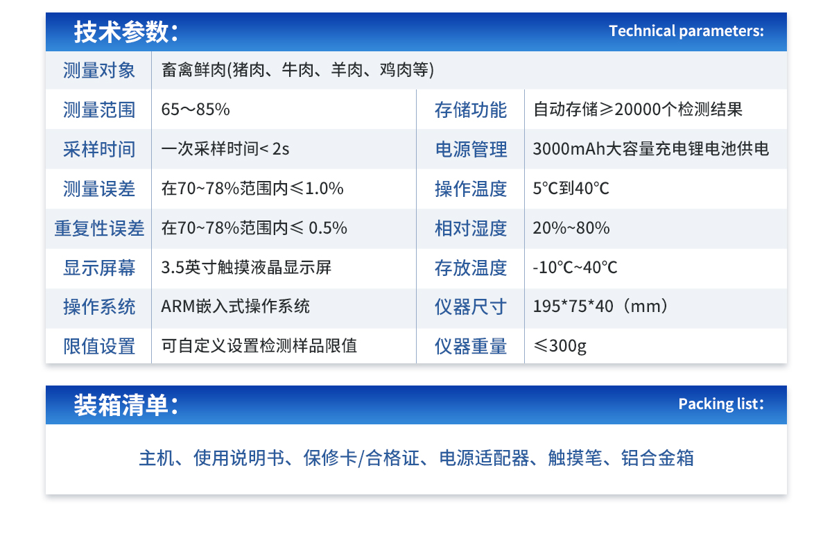 | 1、測(cè)量對(duì)象:畜禽鮮肉(豬肉、牛肉、羊肉、雞肉等); | 2、測(cè)量范圍:65~85%; | 3、采樣時(shí)間:一次采樣時(shí)間< 2s; | 4、測(cè)量誤差:在70~78%范圍內(nèi)≤1.0%; | 5、重復(fù)性誤差:在70~78%范圍內(nèi)≤ 0.5%; | 6、顯示屏幕:3.5英寸觸摸液晶顯示屏; | 7、操作系統(tǒng):ARM嵌入式操作系統(tǒng); | 8、限值設(shè)置:可自定義設(shè)置檢測(cè)樣品限值; | 9、存儲(chǔ)功能:自動(dòng)存儲(chǔ)≥20000個(gè)檢測(cè)結(jié)果; | 10、電源管理:3000mAh大容量充電鋰電池供電; | 11、操作溫度:5℃到40℃; | 12、相對(duì)濕度:20%~80%, | 13、存放溫度:-10℃~40℃; | 14、儀器尺寸(L×W×H):195*75*40(mm); | 15、儀器重量:≤300g。 |
