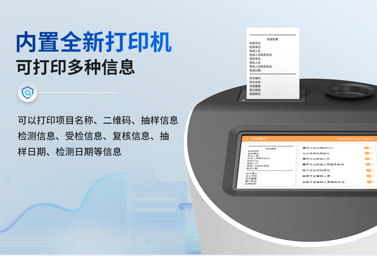 隨著消費者對食品安全問題的日益關(guān)注,雞蛋品質(zhì)檢測成為了保障雞蛋質(zhì)量、維護(hù)消費者健康權(quán)益的重要手段。我司生產(chǎn)的雞蛋品質(zhì)檢測儀可通過專業(yè)的檢測項目和方法,進(jìn)行雞蛋的品質(zhì)檢測和分析。