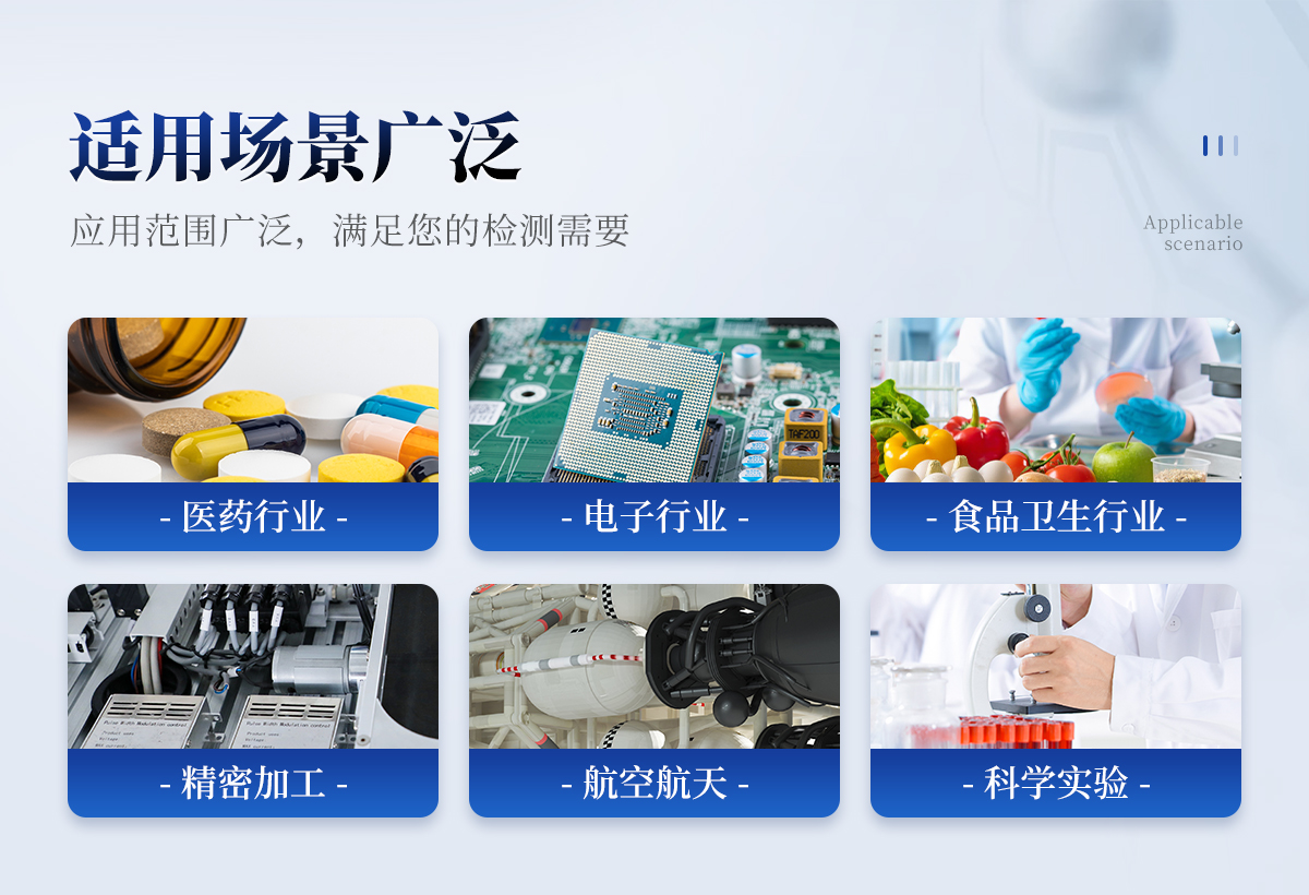 滿足醫(yī)藥行業(yè)(制藥廠、藥檢所、醫(yī)院手術(shù)室等);電子行業(yè)(半導(dǎo)體工廠、精密機(jī)械的生產(chǎn)加工等);食品衛(wèi)生行業(yè)(乳制品、塑封肉食品、調(diào)味食品、農(nóng)產(chǎn)品等的精加工);過濾器的生產(chǎn)廠家,檢驗(yàn)過濾器的質(zhì)量及效率等;光學(xué)、及航空航天等領(lǐng)域的精加工、精密試驗(yàn)所需的潔凈室(區(qū))的檢測(cè)需要。