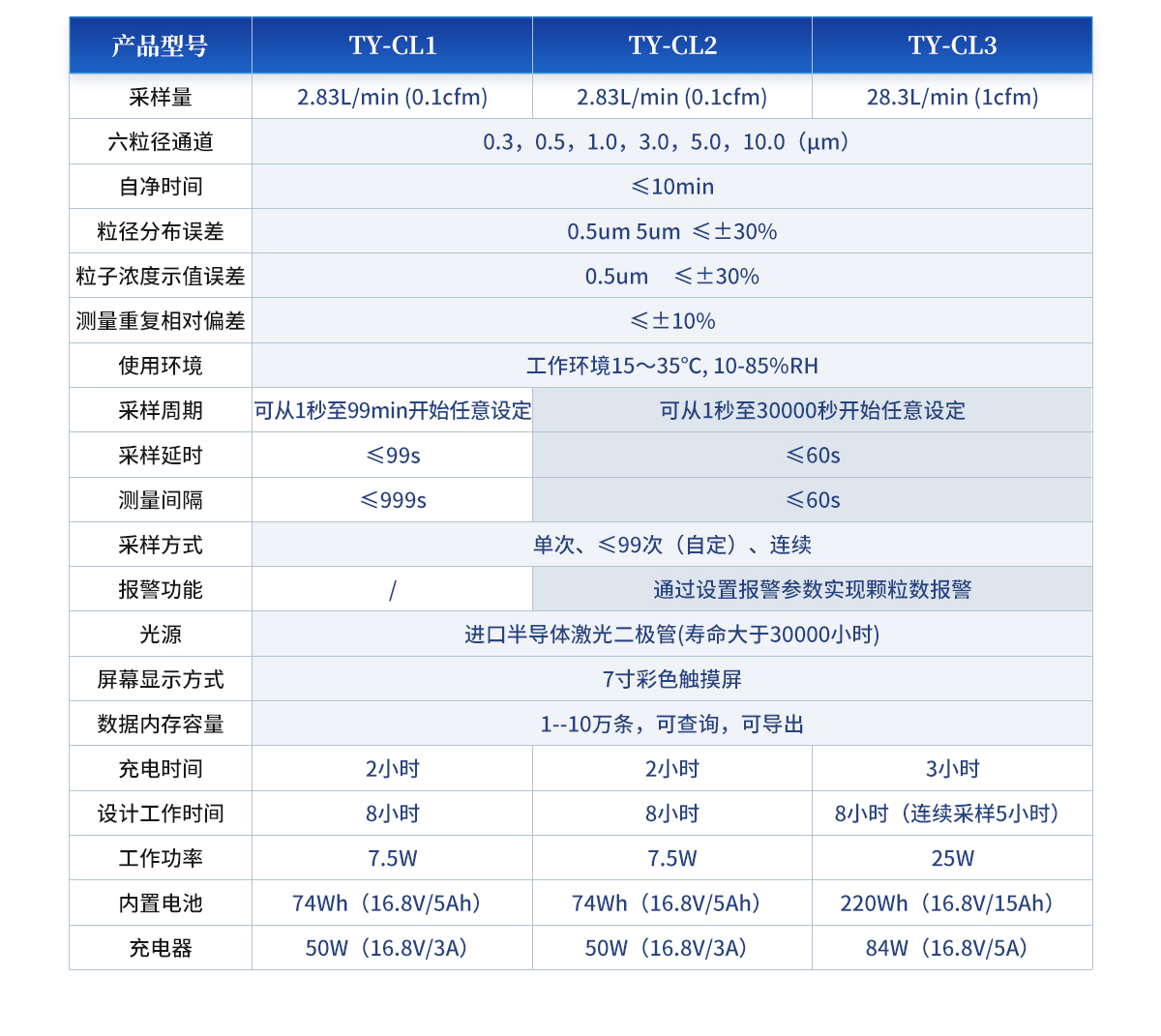 | 采樣量:2.83L/min (0.1cfm) | 六粒徑通道:0.3,0.5,1.0,3.0,5.0,10.0(μm) | 自凈時(shí)間:≤10min | 粒徑分布誤差:0.5um 5um ≤±30% | 粒子濃度示值誤差:0.5um ≤±30% | 測(cè)量重復(fù)相對(duì)偏差:≤±10% | 使用環(huán)境:工作環(huán)境15~35℃, 10-85%RH | 采樣周期:可從1秒至30000秒開始任意設(shè)定 | 采樣延時(shí):≤60s | 測(cè)量間隔:≤60s | 采樣方式:?jiǎn)未?、?9次(自定)、連續(xù) | 報(bào)警功能:通過設(shè)置報(bào)警參數(shù)實(shí)現(xiàn)顆粒數(shù)報(bào)警 | 光源:進(jìn)口半導(dǎo)體激光二極管(壽命大于30000小時(shí)) | 屏幕顯示方式:7寸彩色觸摸屏 | 數(shù)據(jù)內(nèi)存容量:1--10萬(wàn)條,可查詢,可導(dǎo)出。 | 充電時(shí)間:2小時(shí) | 設(shè)計(jì)工作時(shí)間:8小時(shí) | 平均功率:7.5W | 內(nèi)置電池:74Wh(16.8V/5Ah) | 充電器:50W(16.8V/3A) |