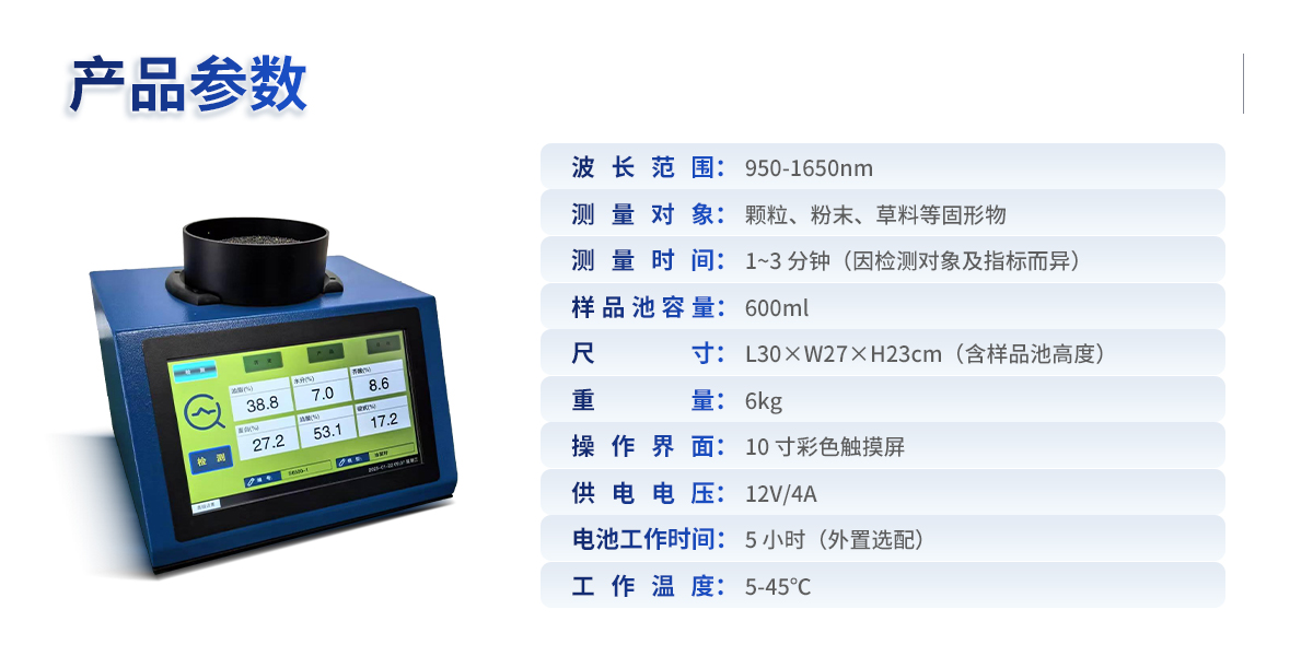 | 波長范圍:950-1650nm | 測量對象:顆粒、粉末、草料等固形物 | 測量時間:1~3 分鐘(因檢測對象及指標(biāo)而異) | 樣品池容量:600ml | 尺寸及重量:L30cm×W27cm×H23cm(含樣品池高度),6kg | 操作界面:10 寸彩色觸摸屏 | 供電電壓:12V/4A | 電池工作時間:5 小時(外置選配) | 工作溫度:5-45℃ |