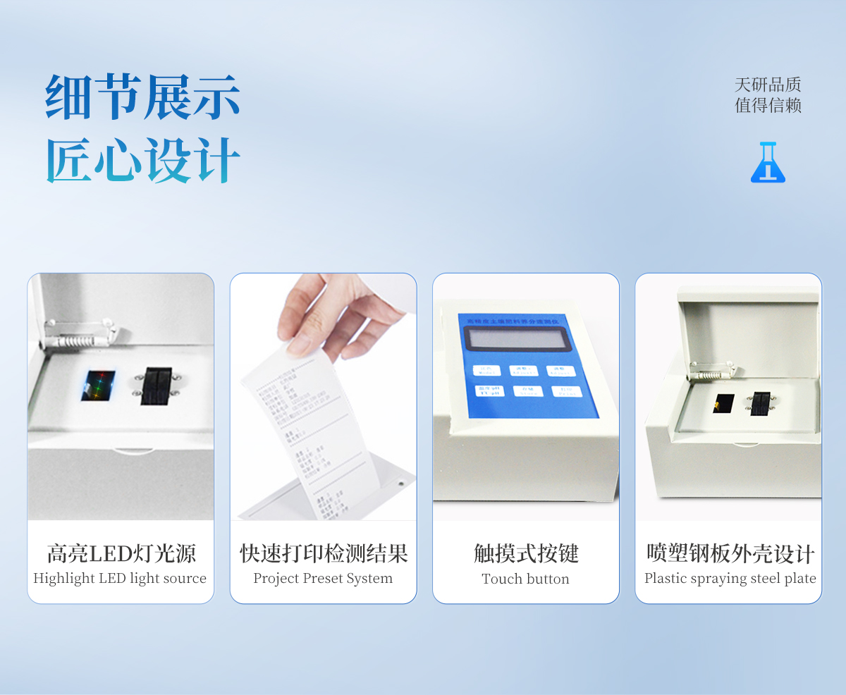 | 性能可靠,工作穩(wěn)定性均優(yōu)于國家標(biāo)準(zhǔn)JJG79-90標(biāo)準(zhǔn)5--6倍,重復(fù)性達(dá)到光柵類分光光度計指標(biāo),采用微處理器技術(shù),單片機(jī)控制,觸摸按鍵,操作簡便。 | 重金屬測試采用聯(lián)合消化和分項測試技術(shù),簡化測試流程,減少測試時間,大大提高測試效率,提高測試精度。 | 擴(kuò)展性強(qiáng),該儀不僅可以專用于重金屬的檢測還可以擴(kuò)展測定土壤、肥料、植株中養(yǎng)分的測試(HM-ZSA型),一機(jī)多用。 | 土壤重金屬檢測儀集藥,器,儀于一體,相當(dāng)于一個小型實(shí)驗(yàn)室, 兩個鋁合金箱體,易于攜帶,便于現(xiàn)場測試,流動服務(wù)。適于基層檢測部門對含有重金屬污染的蔬菜、水果等食品進(jìn)行篩選。 |