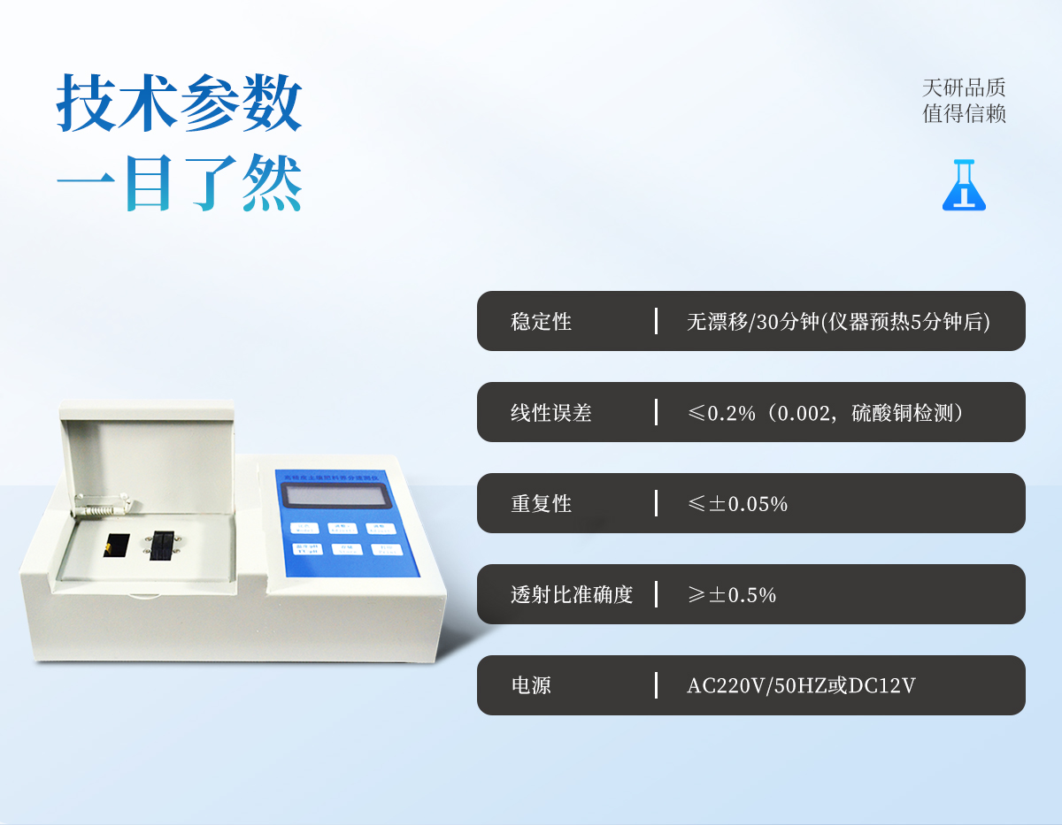 | 儀器透射比準(zhǔn)確度 ≥±0.5% | 儀器重復(fù)性 ≤±0.05% | 儀器穩(wěn)定性 無漂移/30分鐘(儀器預(yù)熱5分鐘后) | 線性誤差 ≤0.2%(0.002,硫酸銅檢測) | 儀器功耗 ≤5W | 電源 AC220V/50Hz或DC12V | 結(jié)果輸出 內(nèi)置**熱敏打印機(jī)可自動打印出檢測結(jié)果,方便直觀。 |