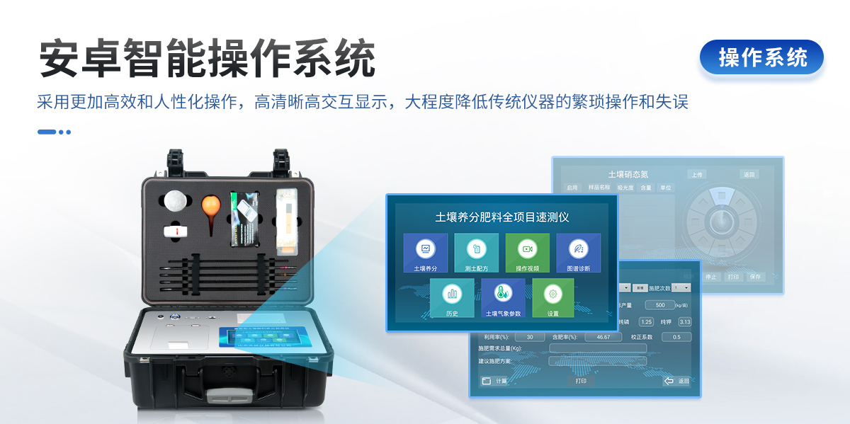 | 安卓智能操作系統(tǒng)Android 7.1版本,主控芯片采用ARM Cortex-A7,RK3288/4核處理器,主頻1.88Ghz,運(yùn)轉(zhuǎn)速度更快速,穩(wěn)定性更強(qiáng)。 | 可檢測(cè)各種土壤、肥料、作物、食品、水質(zhì)、環(huán)境等共200多個(gè)測(cè)試項(xiàng)目,一機(jī)多用,功能齊全。 | 測(cè)試速度更快!無需空白對(duì)照和標(biāo)準(zhǔn)校準(zhǔn),省卻以往繁瑣的操作步驟,一鍵式操作,直接讀取數(shù)據(jù),**率,低消耗。 | 12個(gè)旋轉(zhuǎn)檢測(cè)通道,一次性可快速檢測(cè)12個(gè)樣品,極大提升檢測(cè)效率,降低檢測(cè)成本。 | 采用高精度濾光片技術(shù)自主**分析方法(**號(hào):ZL 2020 2 1763837.9),**認(rèn)證。 | 具有自身保護(hù)功能,內(nèi)置人臉識(shí)別攝像頭可掃臉登錄,也可設(shè)置用戶名和密碼,防止非工作人員操作查看實(shí)驗(yàn)數(shù)據(jù)。 | 檢測(cè)過程中內(nèi)置校準(zhǔn)功能,智能恒流穩(wěn)壓,光強(qiáng)自動(dòng)校準(zhǔn),確保檢測(cè)準(zhǔn)確度,取得中國計(jì)量科學(xué)研究院的《校準(zhǔn)證書》 | 內(nèi)置傳感器航空接口,插拔方便,配備FDR傳感器、環(huán)境多要素傳感器。 | FDR傳感器為土壤三參數(shù)一體式,可同時(shí)測(cè)量土壤水分含量、土壤環(huán)境溫度、土壤電導(dǎo)率(鹽分)方便快捷。 | 環(huán)境多要素傳感器為6要素一體式,可同時(shí)測(cè)量空氣溫度、空氣濕度、露點(diǎn)、大氣壓力、光照度、二氧化碳。 | 儀器標(biāo)配wifi無線上傳、4G聯(lián)網(wǎng)傳輸、GPRS無線遠(yuǎn)傳,快速上傳數(shù)據(jù)。 | 配有智慧云農(nóng)業(yè)平臺(tái),儀器連入無線網(wǎng)絡(luò)后,可將檢測(cè)數(shù)據(jù)可選擇性或批量無線上傳,方便用戶進(jìn)行數(shù)據(jù)管理和長(zhǎng)期分析。 | 儀器配同時(shí)具有USB接口、以太網(wǎng)接口,內(nèi)置大容量?jī)?nèi)存,并可隨時(shí)用U盤拷貝數(shù)據(jù)。 | 可用手機(jī)隨時(shí)登錄云平臺(tái)在線移動(dòng)查看歷史數(shù)據(jù) | 內(nèi)置作物專家施肥系統(tǒng),可對(duì)百余種全國農(nóng)業(yè)經(jīng)濟(jì)作物、果樹等的目標(biāo)產(chǎn)量計(jì)算推薦施肥量,依據(jù)施肥配方科學(xué)指導(dǎo)農(nóng)業(yè)生產(chǎn)。測(cè)土配方施肥結(jié)果可打印,打印內(nèi)容包含:作物種類、肥料種類、目標(biāo)產(chǎn)量、需求總量、建議施肥方案。 | 內(nèi)置植物營(yíng)養(yǎng)診斷標(biāo)準(zhǔn)圖譜,根據(jù)各農(nóng)作物營(yíng)養(yǎng)缺失的圖片,進(jìn)行葉面對(duì)比,診斷豐缺。 | 4波長(zhǎng)專業(yè)測(cè)試?yán)涔庠矗t、藍(lán)、綠、橙),光源波長(zhǎng)穩(wěn)定,長(zhǎng)時(shí)間連續(xù)工作光源無溫漂現(xiàn)象,壽命長(zhǎng)達(dá)10萬小時(shí)級(jí)別,重現(xiàn)性好,準(zhǔn)確度高。 | 比色池部分采用標(biāo)準(zhǔn)1cm比色皿,無機(jī)械位移及磨損,光路測(cè)試定位**,有效屏蔽外光干擾,保證檢測(cè)結(jié)果優(yōu)于國標(biāo)要求。 | 儀器系統(tǒng)內(nèi)帶有樣品前處理操作視頻,各種樣品檢測(cè)方法點(diǎn)擊視頻模塊即可觀看,檢測(cè)人員無需自學(xué)說明書,指導(dǎo)教學(xué)方便快速,方便新手快速操作。 | 內(nèi)置新一代高速熱敏打印機(jī)(無需色帶),打印內(nèi)容包含:檢測(cè)單位、檢測(cè)人員、檢測(cè)項(xiàng)目、通道號(hào)、吸光度、養(yǎng)分含量(mg/kg)、檢測(cè)時(shí)間、以及二維碼等信息 | 高靈敏7寸真彩觸摸屏,采用更加**和人性化操作,高清晰高交互顯示,大程度降低傳統(tǒng)儀器的繁瑣操作和失誤,并取得多項(xiàng)《軟件著作權(quán)》。 | 內(nèi)置時(shí)鐘功能,方便操作時(shí)間記錄,長(zhǎng)期歷史追溯。 | 可設(shè)置多賬戶賬號(hào)密碼登錄,**UI交互界面,不同的用戶可自由添加編輯檢測(cè)信息,保存后可長(zhǎng)期使用。 | GPS功能:可在野外作業(yè)時(shí)記錄經(jīng)緯度地點(diǎn),滿足特殊用戶需求。 | 內(nèi)置低電壓提示功能,可在檢測(cè)時(shí)明確電量,避免測(cè)試數(shù)據(jù)偏移,同時(shí)具有斷電保護(hù)功能,斷電自動(dòng)保存數(shù)據(jù),防止數(shù)據(jù)丟失。 | 交直流兩用供電方式,內(nèi)置大容量充電鋰電池,滿電狀態(tài)下可連續(xù)工作10余小時(shí),同時(shí)可外接車載電源蓄電 | 儀器具有中英文切換功能,可滿足出口要求。 | 高強(qiáng)度PVC工程塑料手提箱設(shè)計(jì),堅(jiān)固耐用,便于攜帶。 |