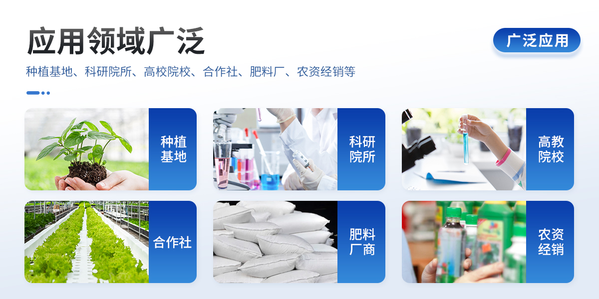 | 土壤:● 有機(jī)質(zhì)、酸堿度(pH試紙法)等; | 肥料:● 單質(zhì)化肥中的有機(jī)質(zhì); ● 復(fù)(混)合肥及尿素中的有機(jī)質(zhì); ● 有機(jī)肥中有機(jī)質(zhì); | 植株:● 植株中有機(jī)質(zhì)。 |
