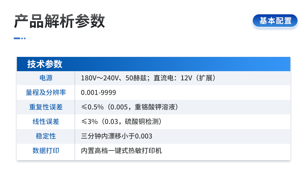 | 電源:交流電:180V~240V、50赫茲;直流電:12V(擴(kuò)展) | 量程及分辨率:0.001-9999 | 穩(wěn)定性:三分鐘內(nèi)漂移小于0.003 | 線(xiàn)性誤差:≤3%(0.03,硫酸銅檢測(cè)) | 重復(fù)性誤差:≤0.5%(0.005,重鉻酸鉀溶液) | 靈敏度:紅光≥4.5 ×10-5 藍(lán)光≥3.17×10-3 | 波長(zhǎng)范圍:紅光620±8nm 藍(lán)光440±8nm | 測(cè)試速度:測(cè)一個(gè)土樣有機(jī)質(zhì)≤60分鐘(含前處理時(shí)間) | 可同時(shí)檢測(cè)8個(gè)土樣≤個(gè)小時(shí)(含前處理時(shí)間) | 數(shù)據(jù)打?。簝?nèi)置高檔一鍵式熱敏打印機(jī)(國(guó)內(nèi)首家**設(shè)計(jì)) |