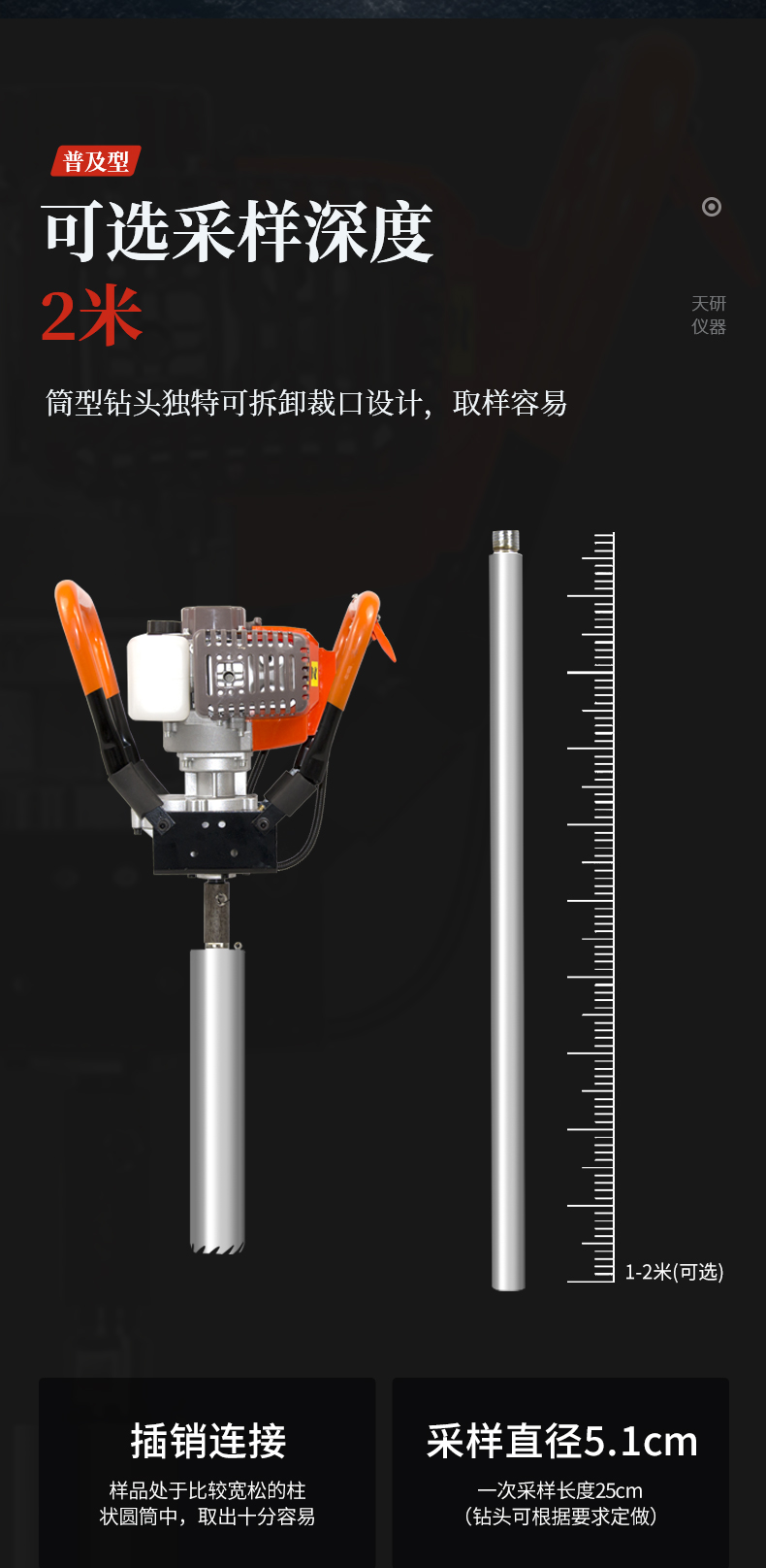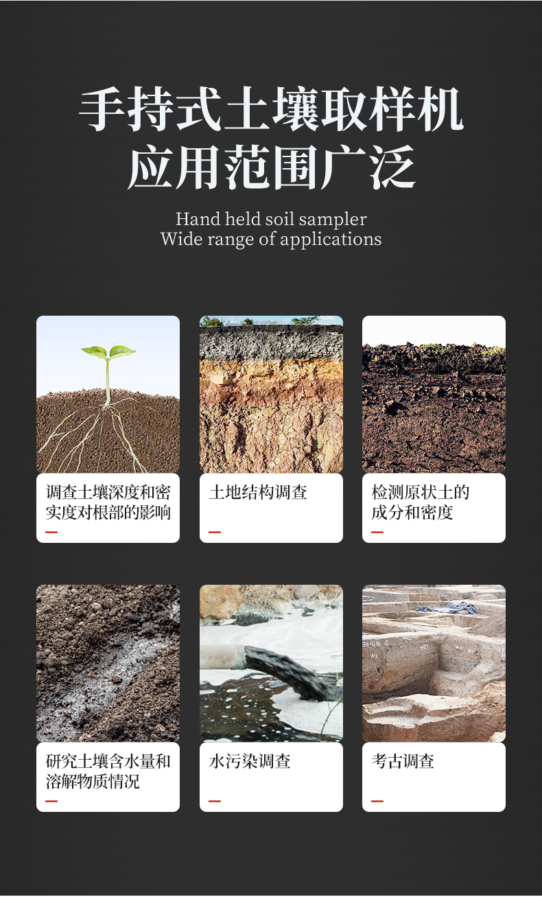| 旋轉(zhuǎn)式,上下沒有擾動(dòng),不會(huì)破壞土壤剖面結(jié)構(gòu) | 采樣量大,插銷連接,易于拆卸。 | 鉆頭帶有鋸齒,通過沖擊錘鉆入土壤,入土容易。 | 筒型鉆頭獨(dú)特可拆卸裁口設(shè)計(jì),取樣容易。 | 樣品處于比較寬松的柱狀圓筒中,取出十分容易 | 狀土壤很難被壓縮(保持原狀) | 采集一個(gè)樣本就可以研究整個(gè)土壤剖面情況 | 比開挖一個(gè)采樣坑要節(jié)約時(shí)間和減少樣本破壞 | 可有效地用于所有類型的土壤 |