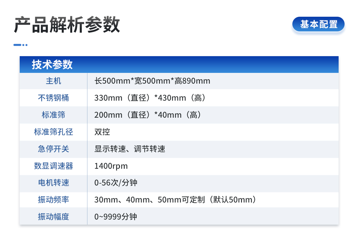 | 1、主機(jī):長(zhǎng)500mm*寬500mm*高890mm | 2、水桶:200mm(直徑)*400mm(高) | 3、標(biāo)準(zhǔn)篩:100mm(直徑)*40mm(高) | 4、標(biāo)準(zhǔn)篩孔徑:5mm,3mm,2mm,1mm,0.5mm,0.25mm。(可選配其他規(guī)格孔徑) | 5、急停開(kāi)關(guān):雙控 | 6、數(shù)顯調(diào)速器:顯示轉(zhuǎn)速、調(diào)節(jié)轉(zhuǎn)速 | 7、電機(jī)轉(zhuǎn)速:1400 rpm | 8、振動(dòng)頻率:0-56次/分鐘 | 9、振動(dòng)幅度:30mm、40mm、50mm可定制(默認(rèn)50mm) | 10、計(jì)時(shí):數(shù)顯計(jì)時(shí)器 | 11、定時(shí)范圍:0~9999分鐘 | 12、電源:220V 50Hz 120W | 13、漏電保護(hù)器:10A |
