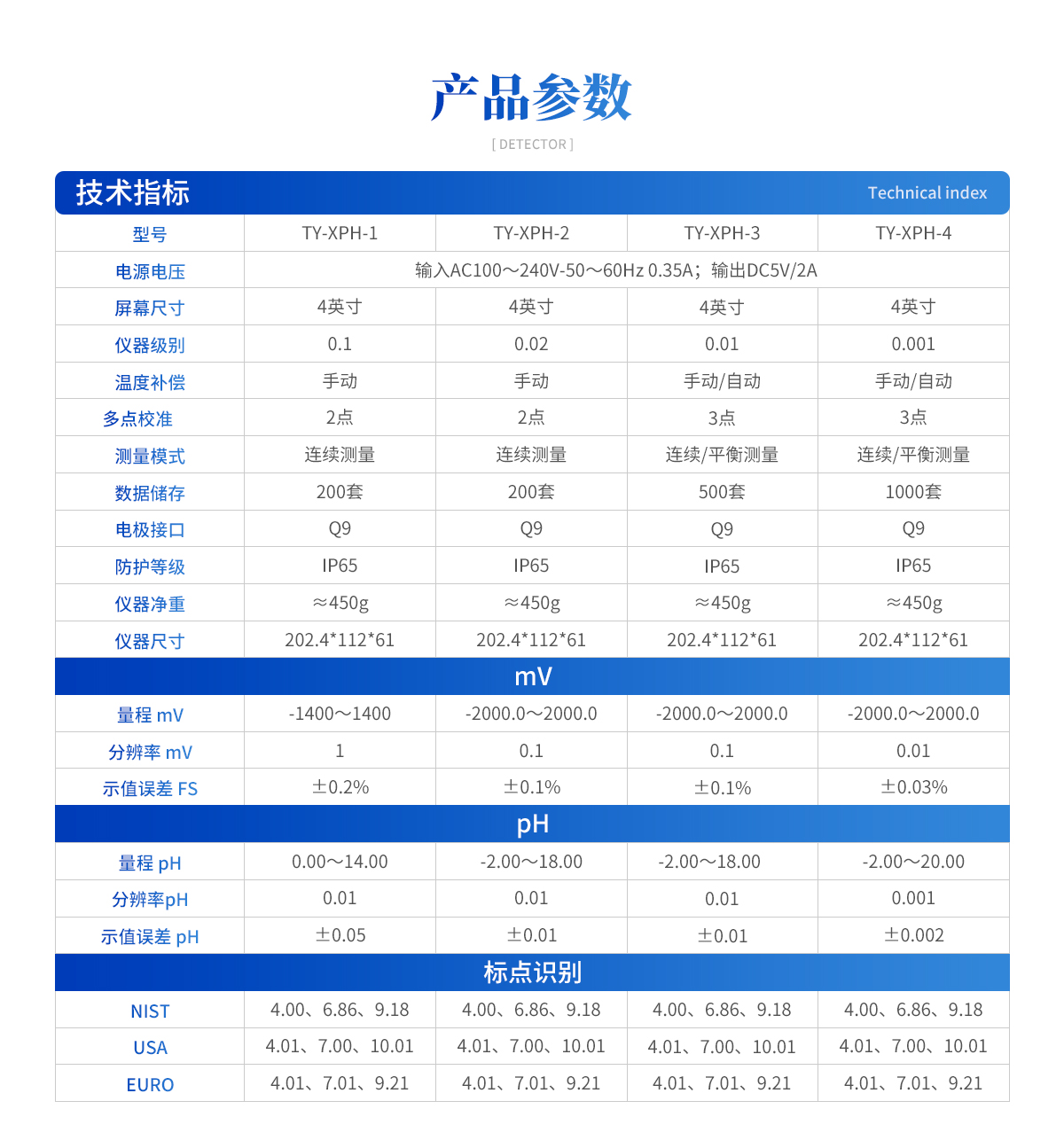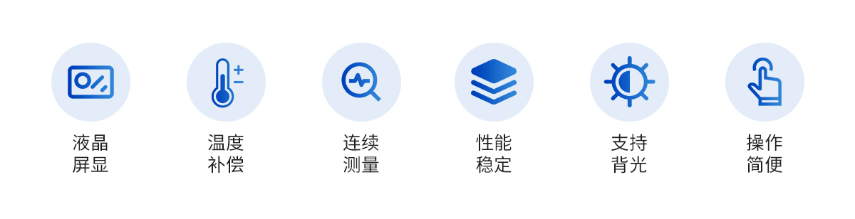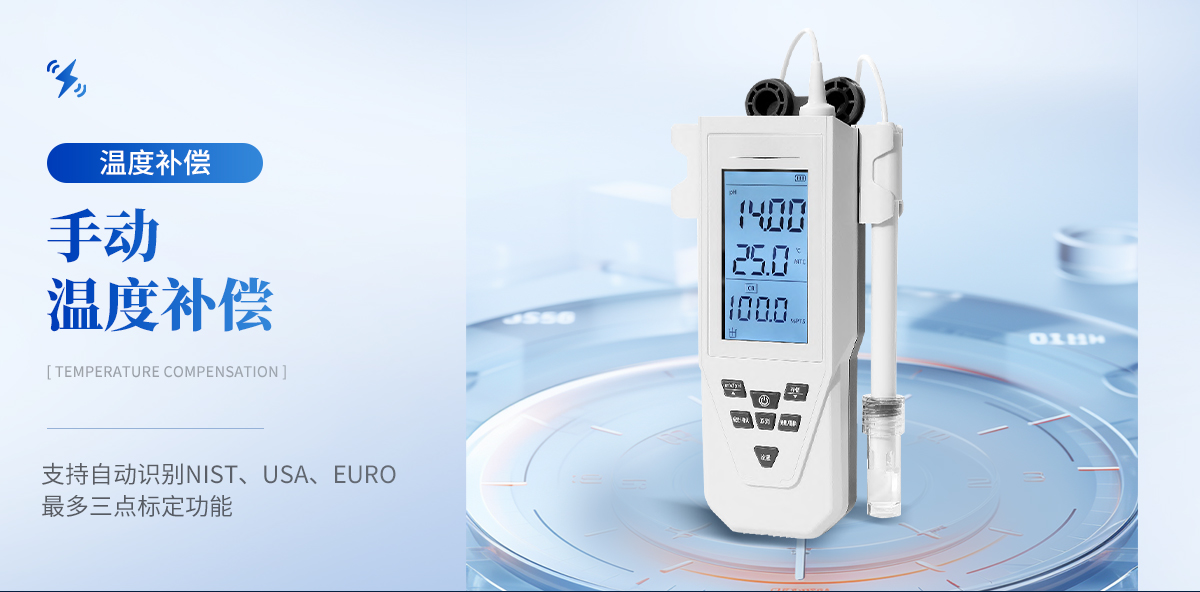 | 1.支持IP65防護等級。 | 2.支持自動識別NIST、USA、EURO*多三點標定功能。 | 3.支持背光和恢復出廠、手動溫補、連續(xù)測量模式功能。 | 4.顯示標定、測量和數(shù)據(jù)穩(wěn)定符號及溫度、電極斜率數(shù)據(jù)。 | 5.支持數(shù)據(jù)儲存、查閱、刪除功能。 |