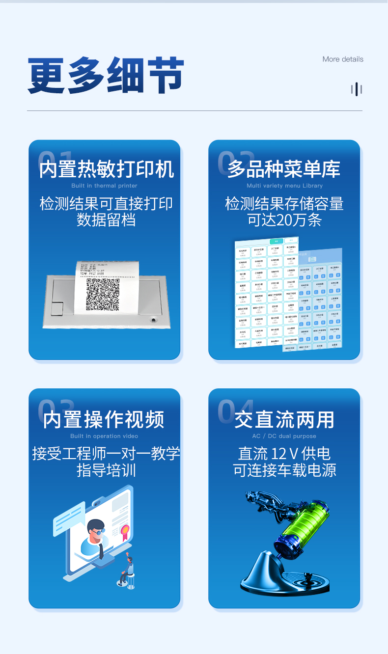 | 安卓智能操作系統(tǒng),采用更加**UI交互界面,儀器具有wifi聯(lián)網(wǎng)上傳、4G聯(lián)網(wǎng)傳輸、GPRS無線遠(yuǎn)傳、網(wǎng)線連接功能,快速批量上傳數(shù)據(jù)。 | 智能化程度高,儀器具有自檢功能:具有開機(jī)自檢和調(diào)零功能,具有自動(dòng)檢測(cè)重復(fù)性功能。 | 新一代高速熱敏打印機(jī),檢測(cè)完成可自動(dòng)打印檢測(cè)報(bào)告和二維碼。 | 儀器帶有監(jiān)管平臺(tái),數(shù)據(jù)可局域網(wǎng)和互聯(lián)網(wǎng)數(shù)據(jù)上傳,檢測(cè)結(jié)果直接傳至食品安全監(jiān)管平臺(tái)。進(jìn)行區(qū)域食品安全監(jiān)管及大數(shù)據(jù)分析處理與數(shù)據(jù)統(tǒng)計(jì),檢測(cè)區(qū)域食品安全長(zhǎng)短期動(dòng)態(tài),達(dá)到食品安全問題預(yù)估、預(yù)警 | 一體化便攜式快檢設(shè)備,滿足現(xiàn)場(chǎng)及流動(dòng)檢測(cè)使用需求,能夠在同一軟件下實(shí)現(xiàn)所有檢測(cè)項(xiàng)目的檢測(cè),并可通過同一窗口直觀顯示檢測(cè)結(jié)果。 | 膠體金模塊檢測(cè)方式:軌道式自動(dòng)傳輸掃描,檢測(cè)完成后自動(dòng)退出檢測(cè)卡。 | 一體化主機(jī),包含食品安全檢測(cè)模塊、多通道農(nóng)藥殘留檢測(cè)模塊、膠體金免疫層析檢測(cè)模塊。 | CT線自動(dòng)識(shí)別,無需手動(dòng)調(diào)整。 | 儀器具有品類多種類樣品菜單庫(kù),可靈活選擇檢測(cè)樣品,不同的檢測(cè)通道可同時(shí)檢測(cè)不同的樣品項(xiàng)目。。 | 樣品處理簡(jiǎn)單省力,整體操作快速、安全、便捷。 | 儀器具有自身保護(hù)功能,可設(shè)置用戶名及密碼,防止非工作人員操作等。 | 高靈敏度,高檢測(cè)精度,高重復(fù)性精度,掃描式高精度光學(xué)傳感器。 | 儀器具有重新校準(zhǔn)、鎖定、恢復(fù)出廠設(shè)置功能。 | 內(nèi)置強(qiáng)大的數(shù)據(jù)庫(kù),可在儀器上直接選擇樣品名稱、檢測(cè)指標(biāo)、送檢單位等信息,也可在儀器上直接編輯錄入樣品名稱、檢測(cè)指標(biāo)、送檢單位等信息并保存進(jìn)樣品數(shù)據(jù)庫(kù)。 | 儀器具有重新校準(zhǔn)、鎖定、恢復(fù)出廠設(shè)置功能。 | 結(jié)果判定線可修改,對(duì)照值標(biāo)定值可保存,斷電不丟失數(shù)據(jù)。 | 兼容市場(chǎng)上所有的膠體金卡,使用耗材不受限制,極大增強(qiáng)用戶使用體驗(yàn)。 |